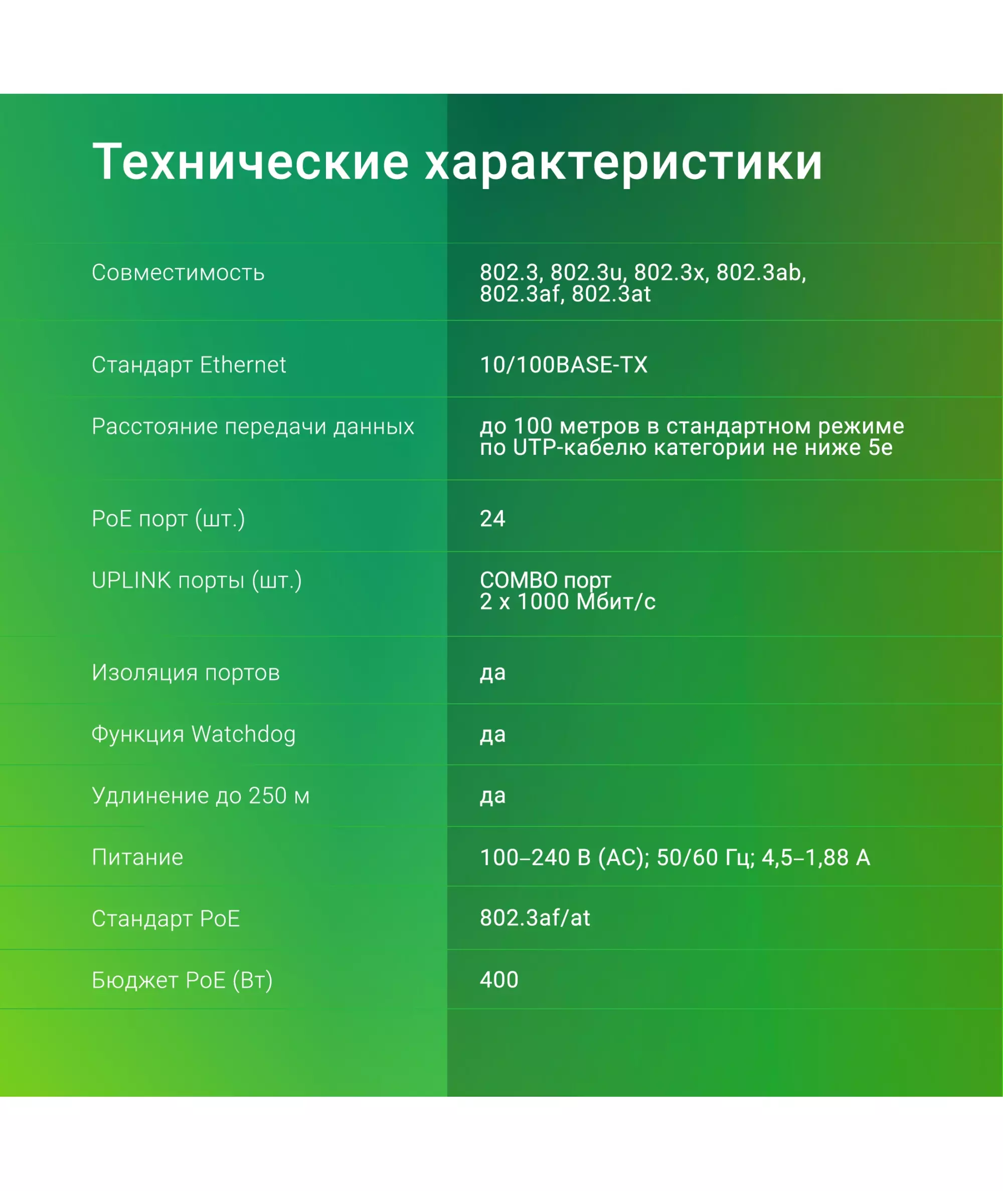 | Сетевые стандарты | 802.3, 802.3u, 802.3i, 802.3x, 802.3ab, 802.3af, 802.3at |