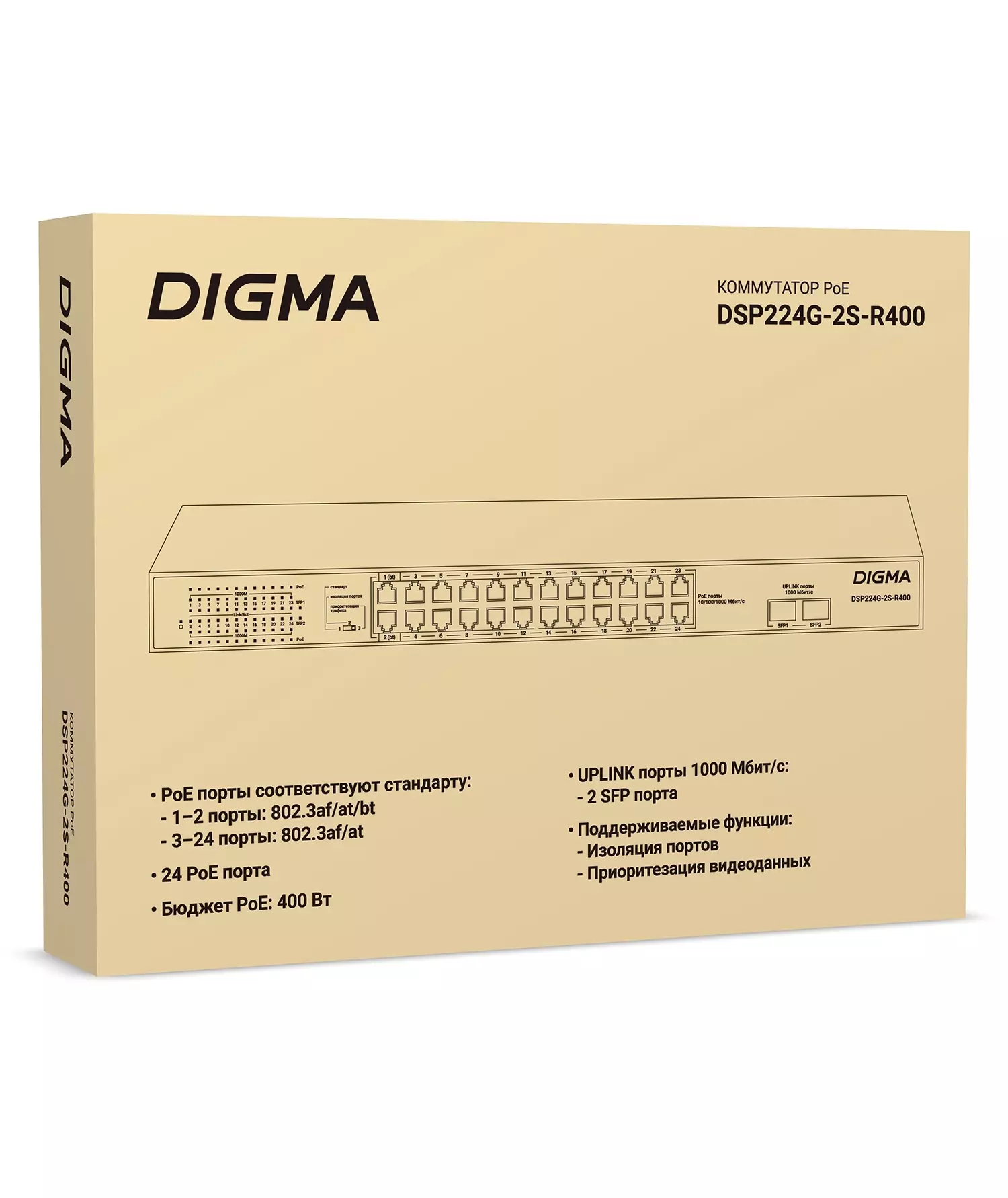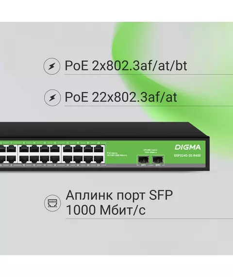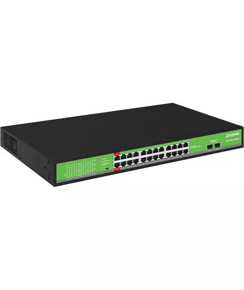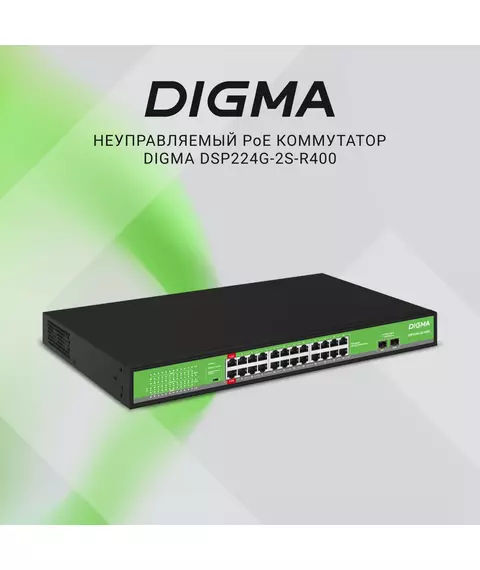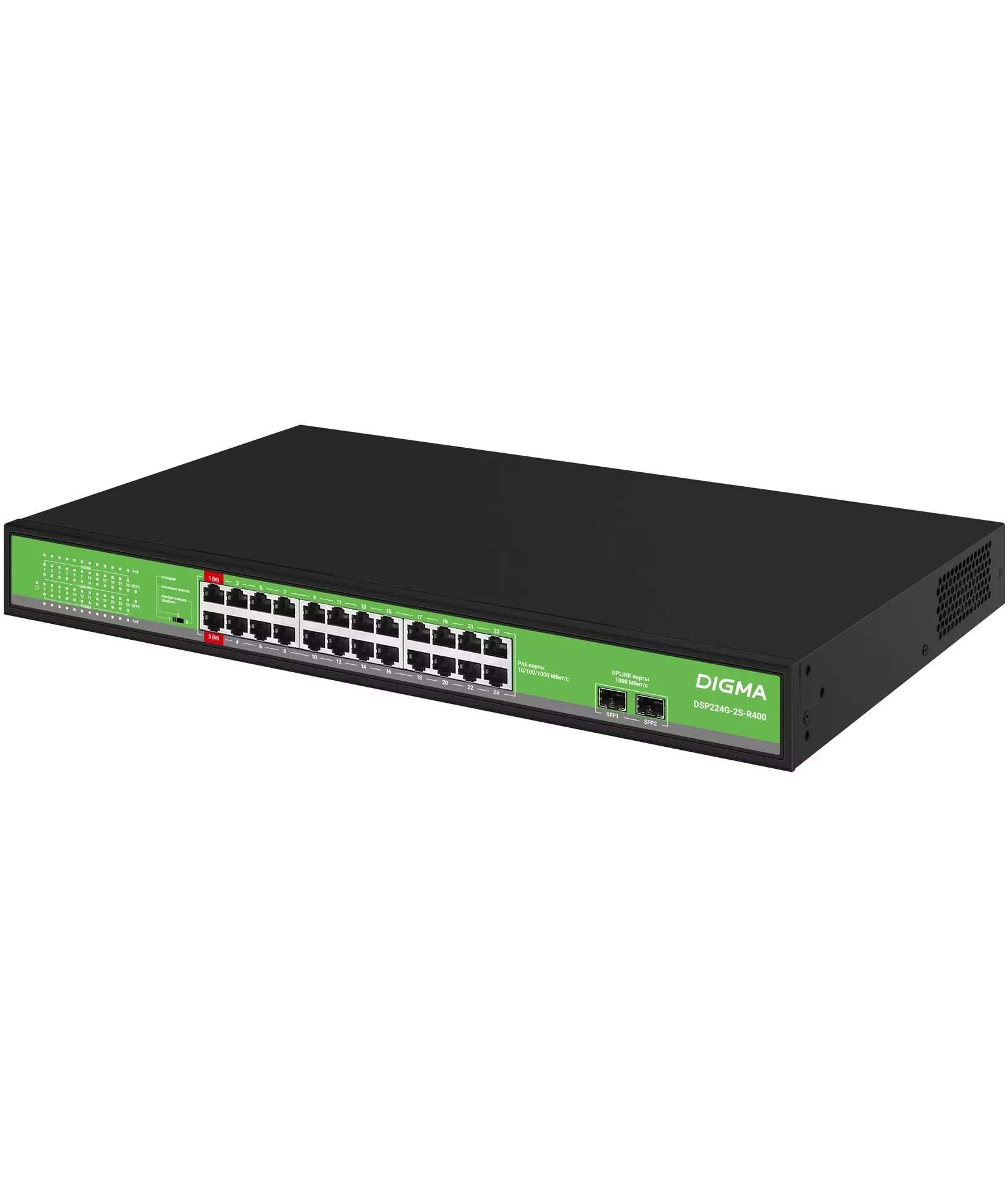 Коммутатор Digma DSP224G-2S-R400 (L2) 24x1Гбит/с 2SFP 24PoE 24PoE+ 2PoE++ 400W неуправляемый