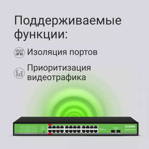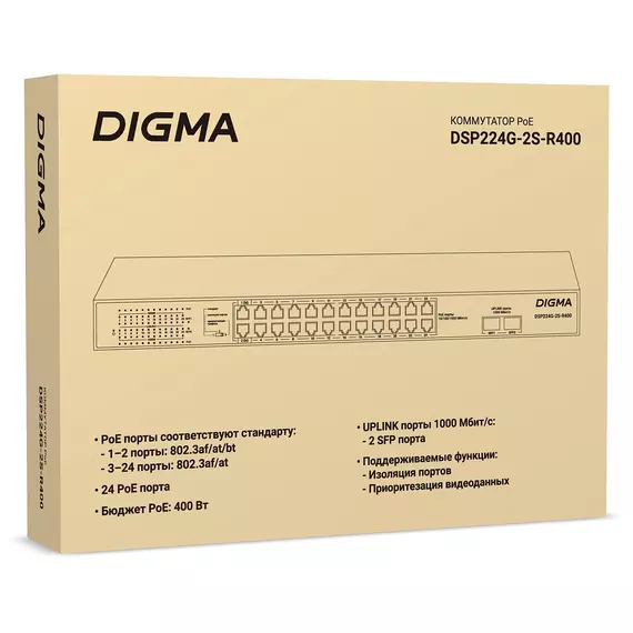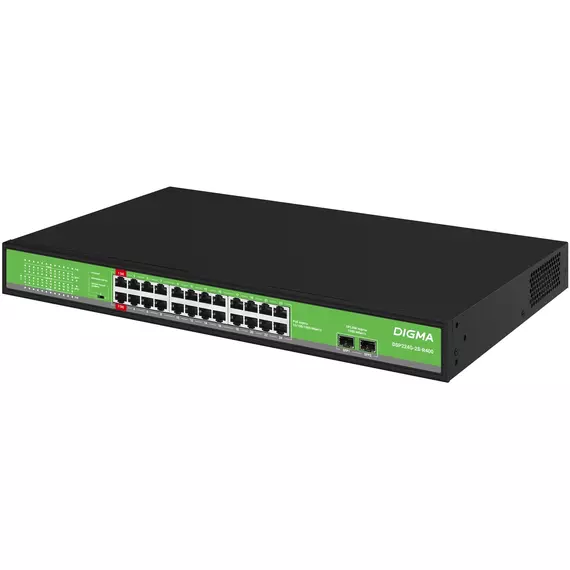 Коммутатор Digma DSP224G-2S-R400 (L2) 24x1Гбит/с 2SFP 24PoE 24PoE+ 2PoE++ 400W неуправляемый