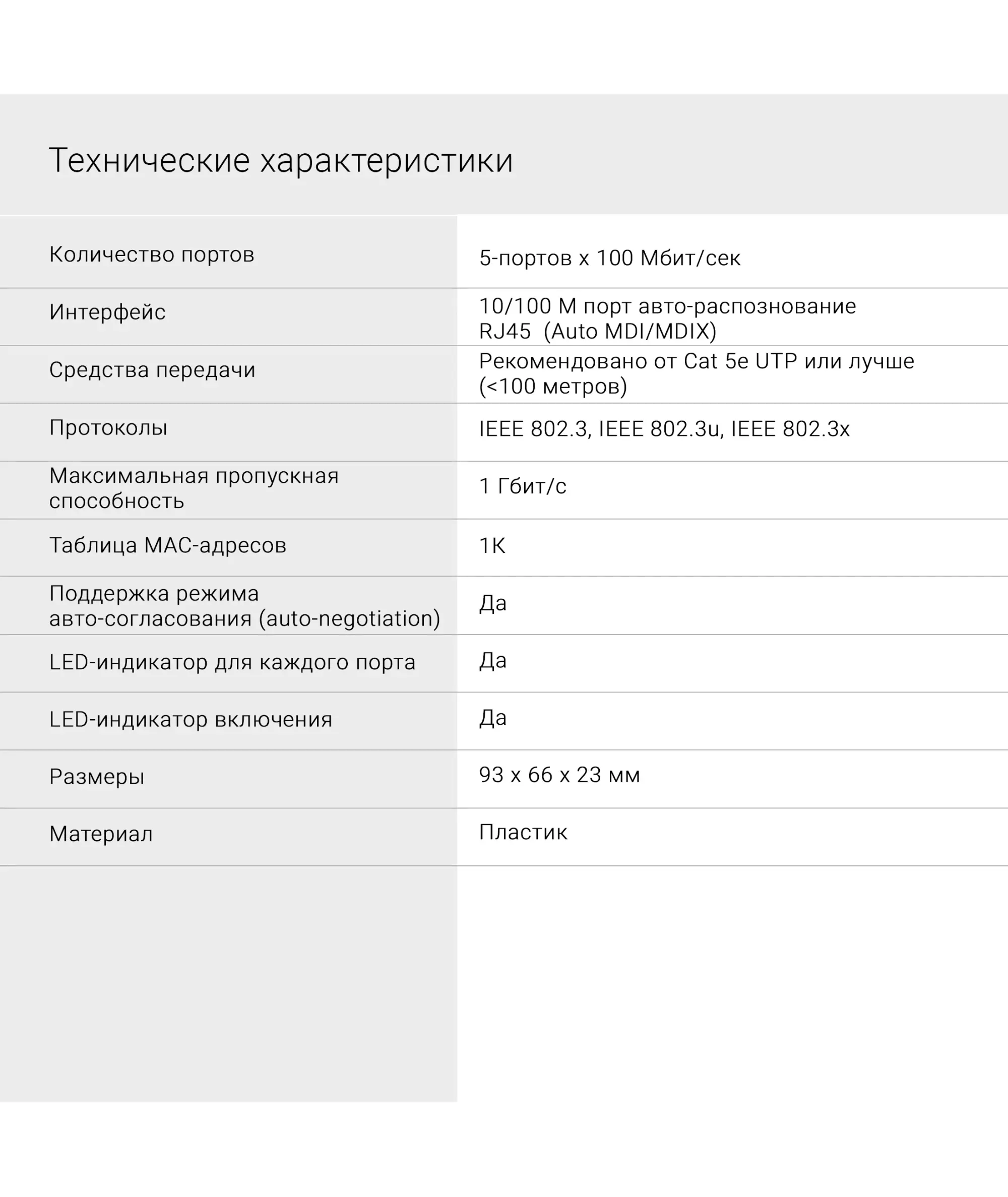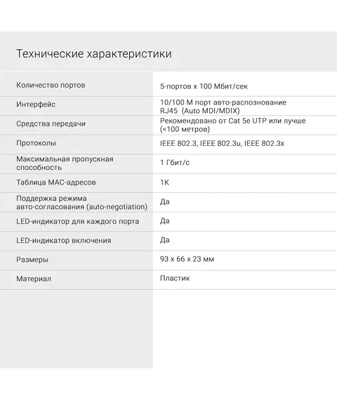 | Особенности2 | Поддержка режима авто-переключения портов (Auto MDI/MDIX) |