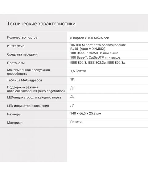 | Особенности2 | Поддержка режима авто-переключения портов (Auto MDI/MDIX) |