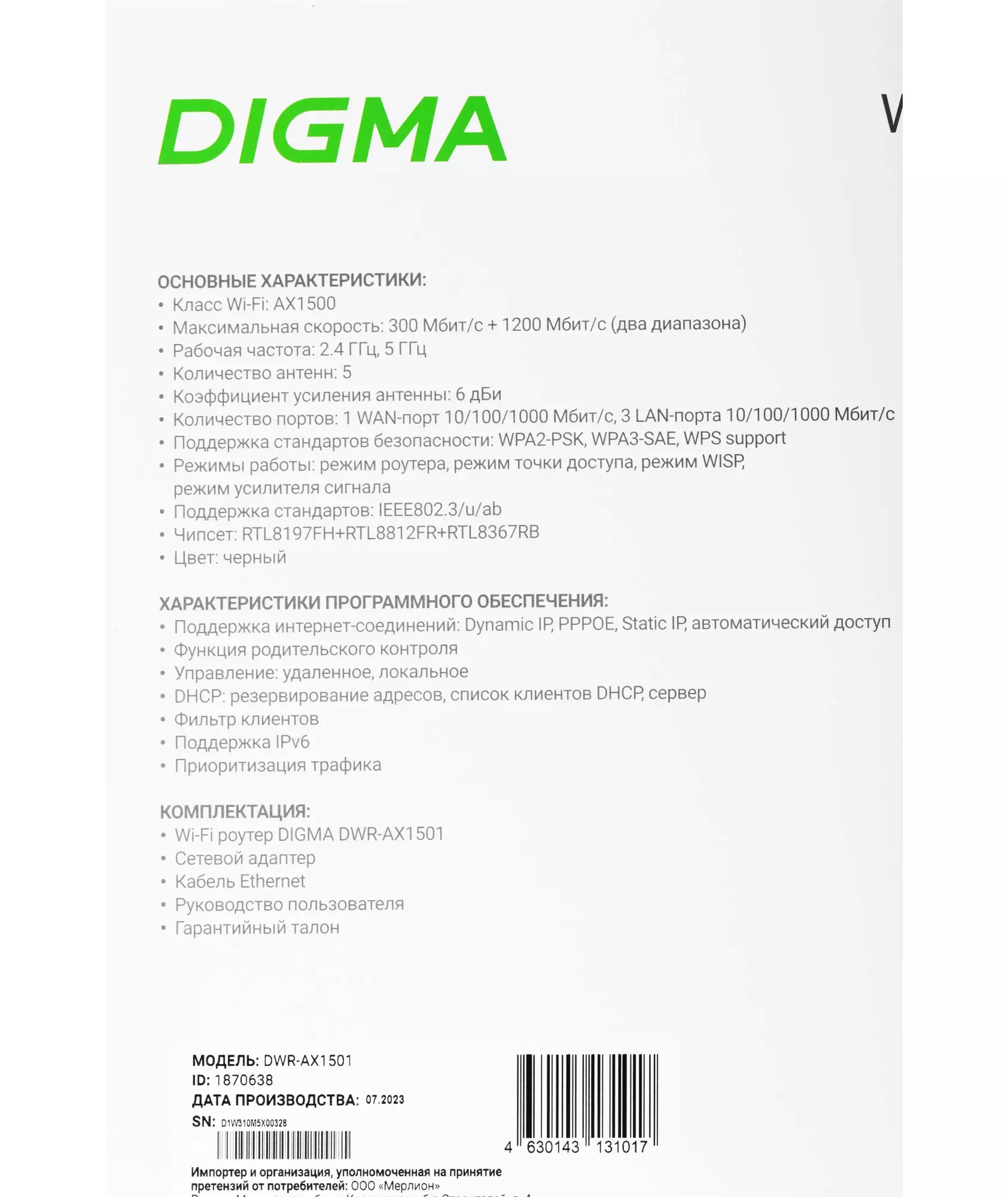 Роутер беспроводной Digma DWR-AX1501 AX1500 10/100/1000BASE-TX черный