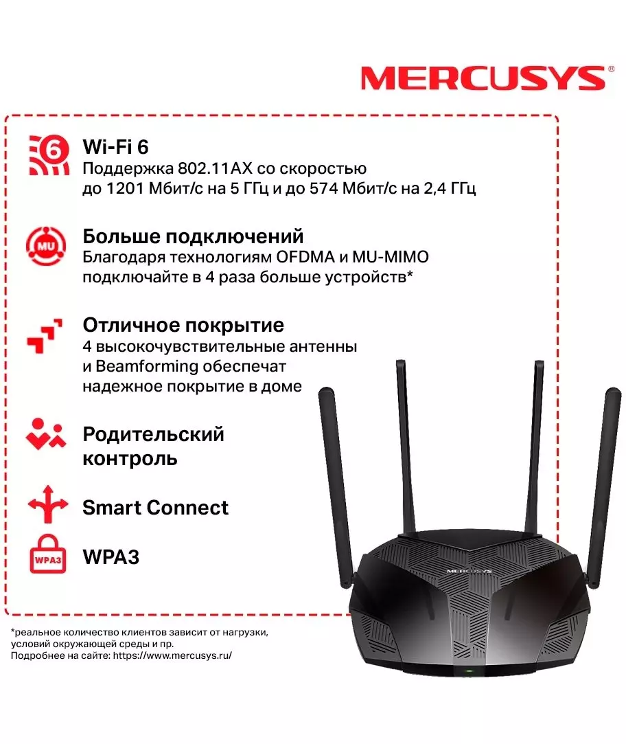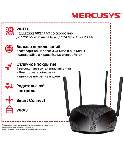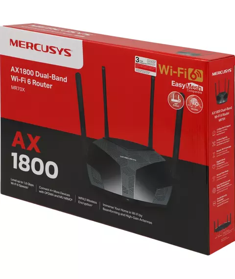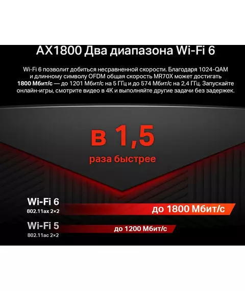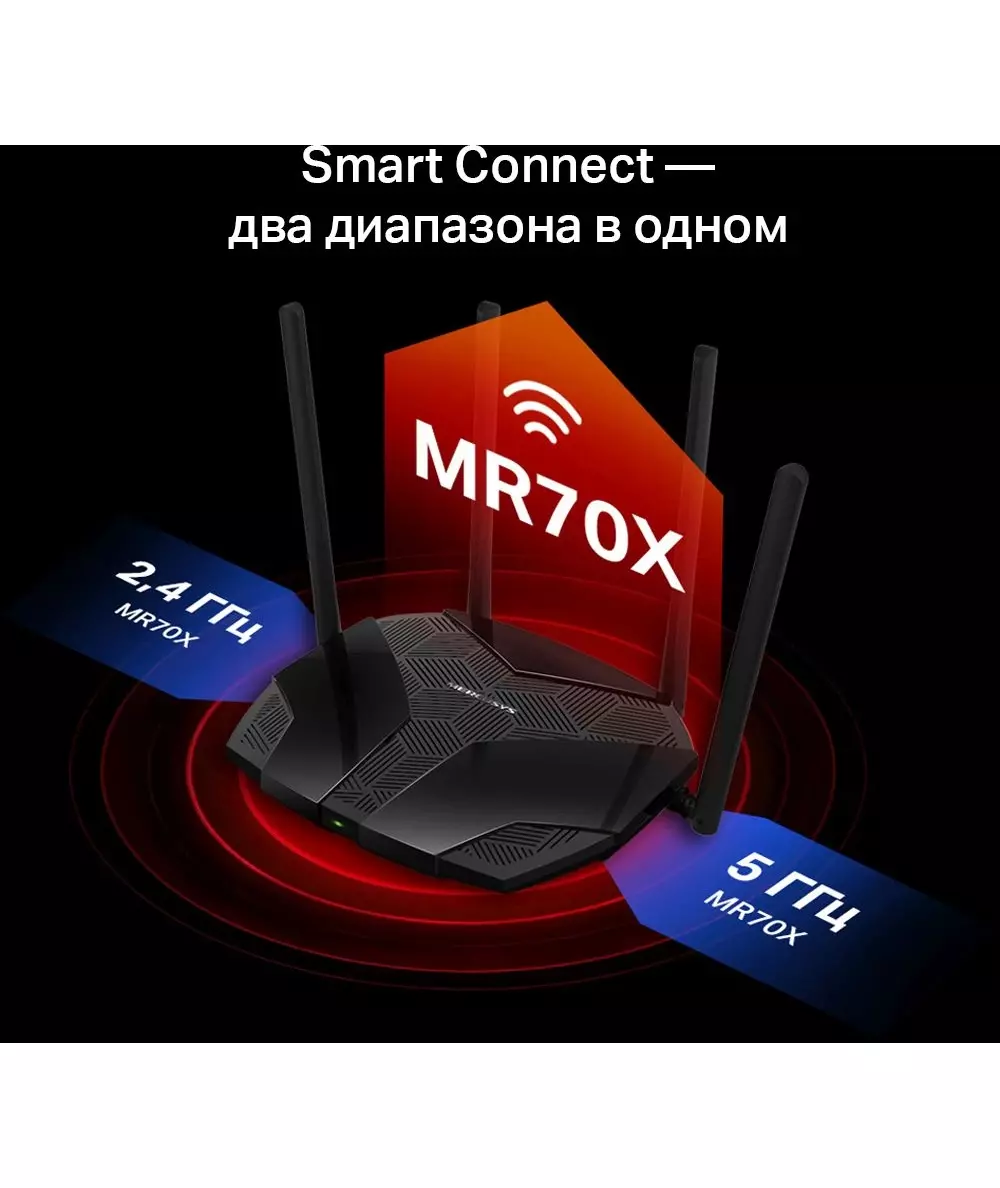 | Комплектация | AX1800 Wi-Fi 6 роутер MR70X, адаптер питания, руководство по быстрой настройке, кабель Ethernet RJ45. |