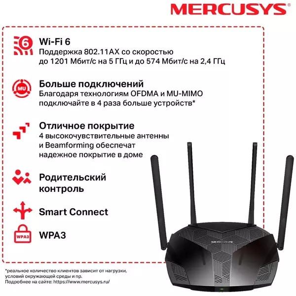 Комплектация | AX1800 Wi-Fi 6 роутер MR70X, адаптер питания, руководство по быстрой настройке, кабель Ethernet RJ45. |