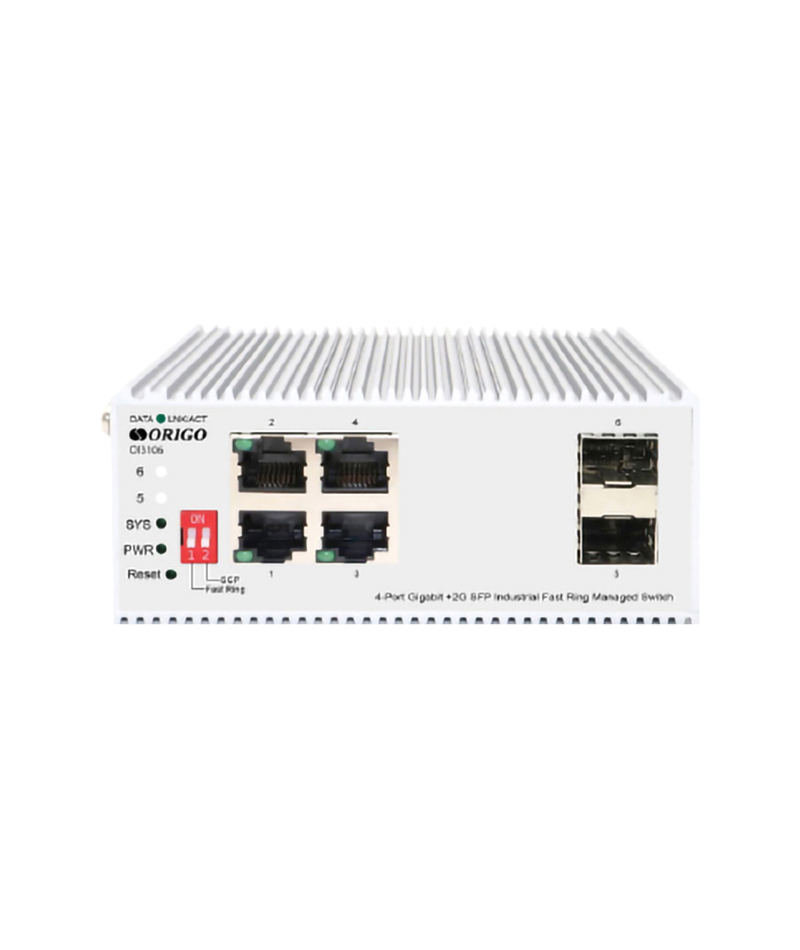Коммутатор ORIGO OI3106/A1A Managed L2 Industrial Fast Ring Switch 4x1000Base-T, 2x1000Base-X SFP, Surge 4KV, -40 to 75°C