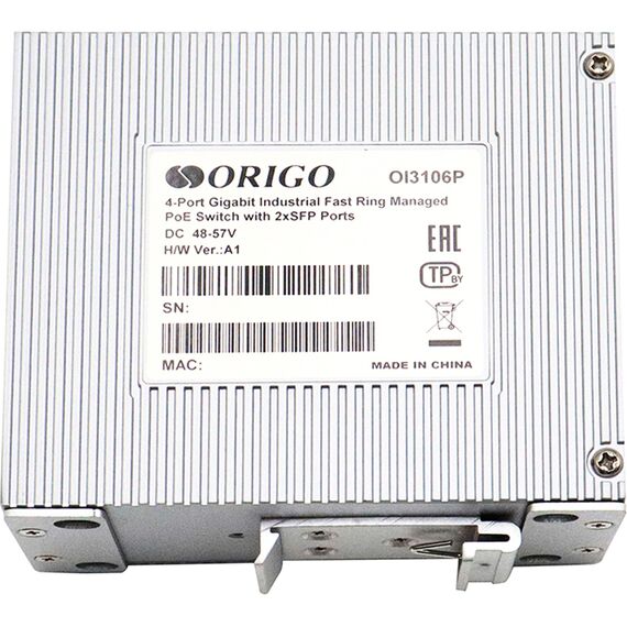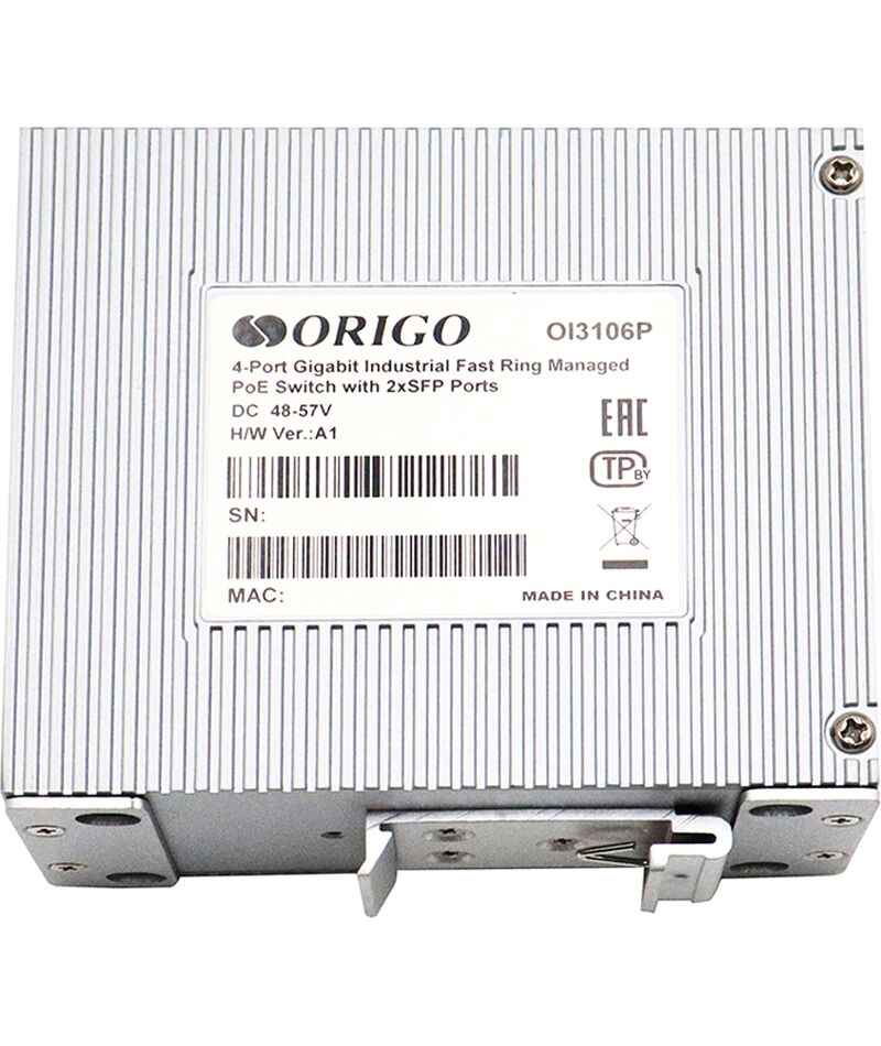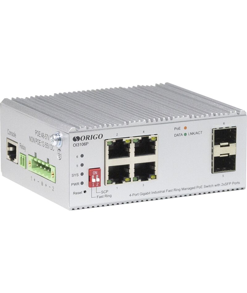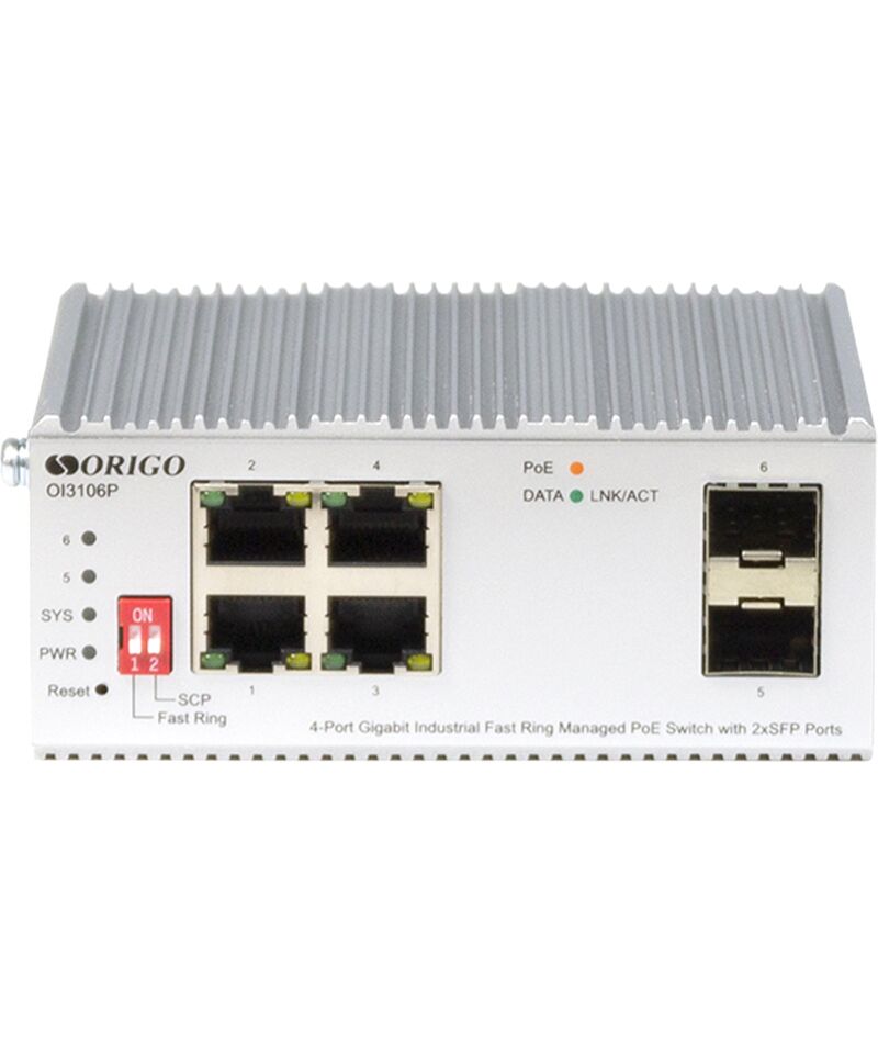 Коммутатор ORIGO OI3106P/60W/A1A Managed L2 Industrial Fast Ring Switch 4x1000Base-T PoE, 2x1000Base-X SFP, PoE Budget 60W, Surge 4KV, -40 to 75°C