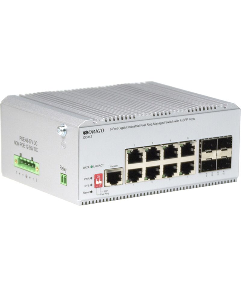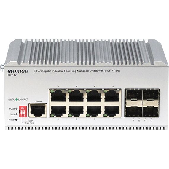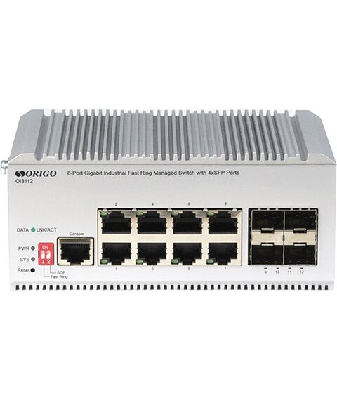 Коммутатор ORIGO OI3112/A1A Managed L2 Industrial Fast Ring Switch 8x1000Base-T, 4x1000Base-X SFP, Surge 4KV, -40 to 75°C
