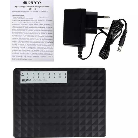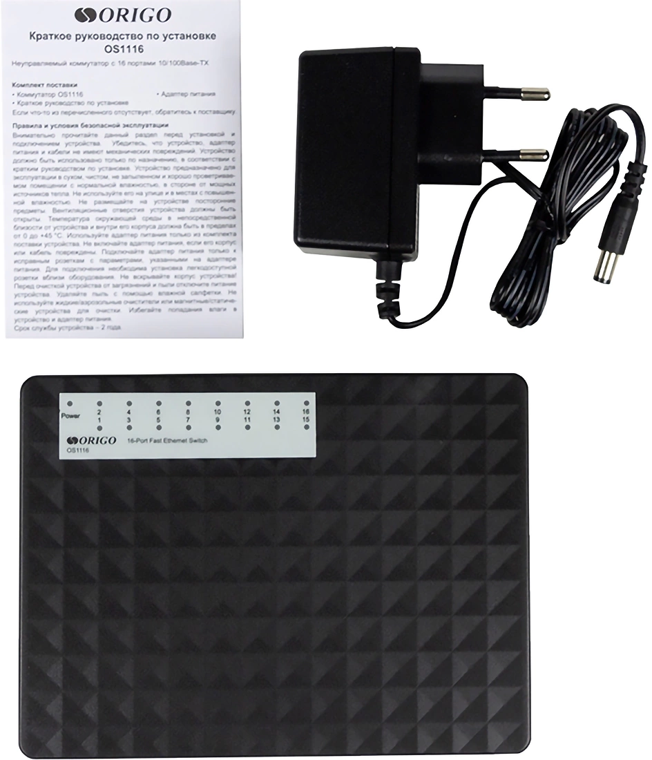 | Комплектация | Коммутатор OS1116, адаптер питания, документация. |