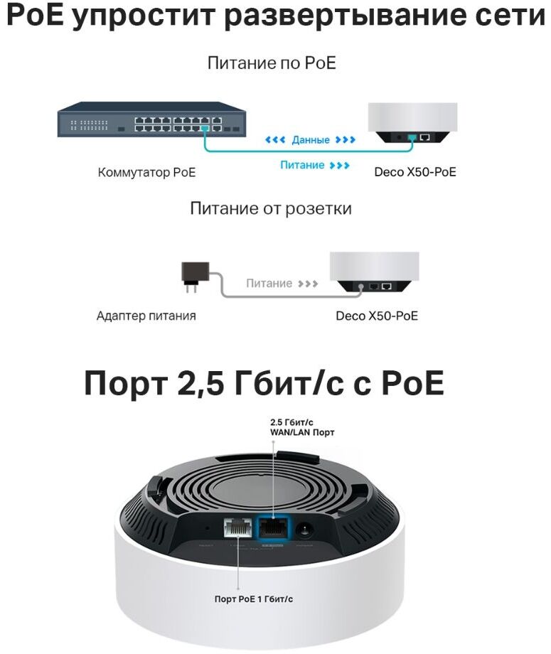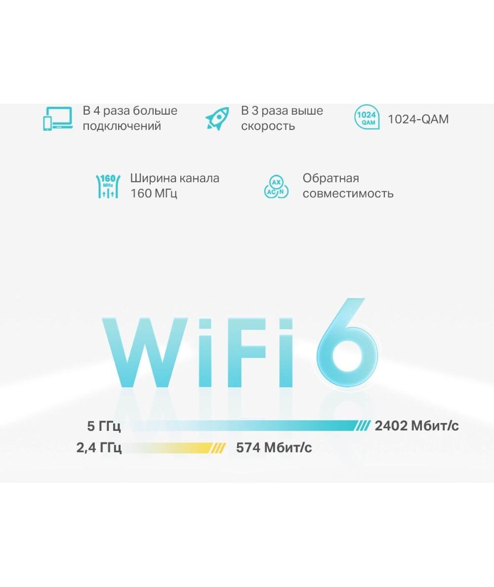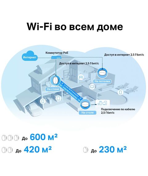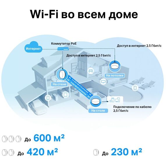 Два диапазона Wi-Fi - до 574 Мбит/с на 2,4 ГГц + до 2402 Мбит/с на 5 ГГц. Разные способы установки - на столе, на потолке или на стене. Поддержка PoE - упростит развёртывание сети. Высокая скорость подключения по кабелю до 1 и 2,5 Гбит/с.