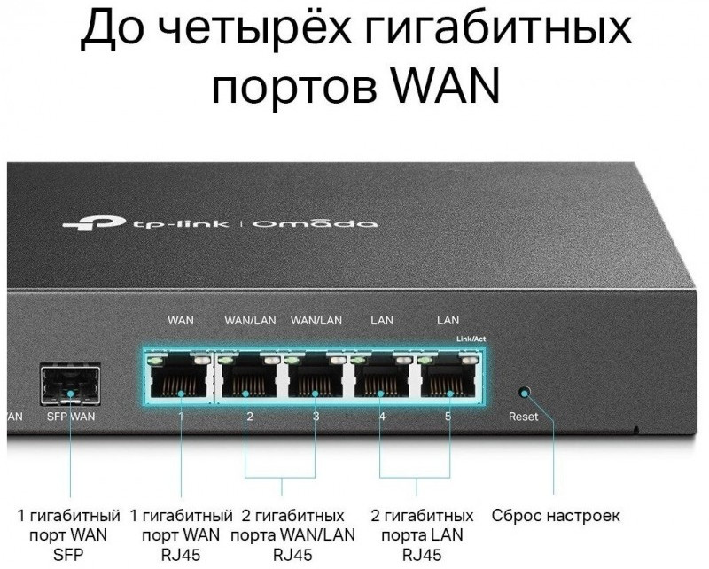 - Порты WAN: 1 порт SFP, 3 порта RJ-45 1 Гбит/сек, 2 из них разделяемые с LAN