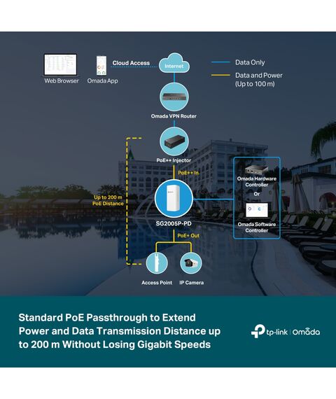 - Централизованное облачное управление: интеграция с платформой Omada, обеспечивающей облачный доступ и удалённое управление множеством территориально разделённых сетей.
