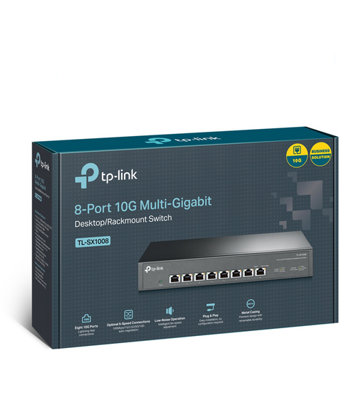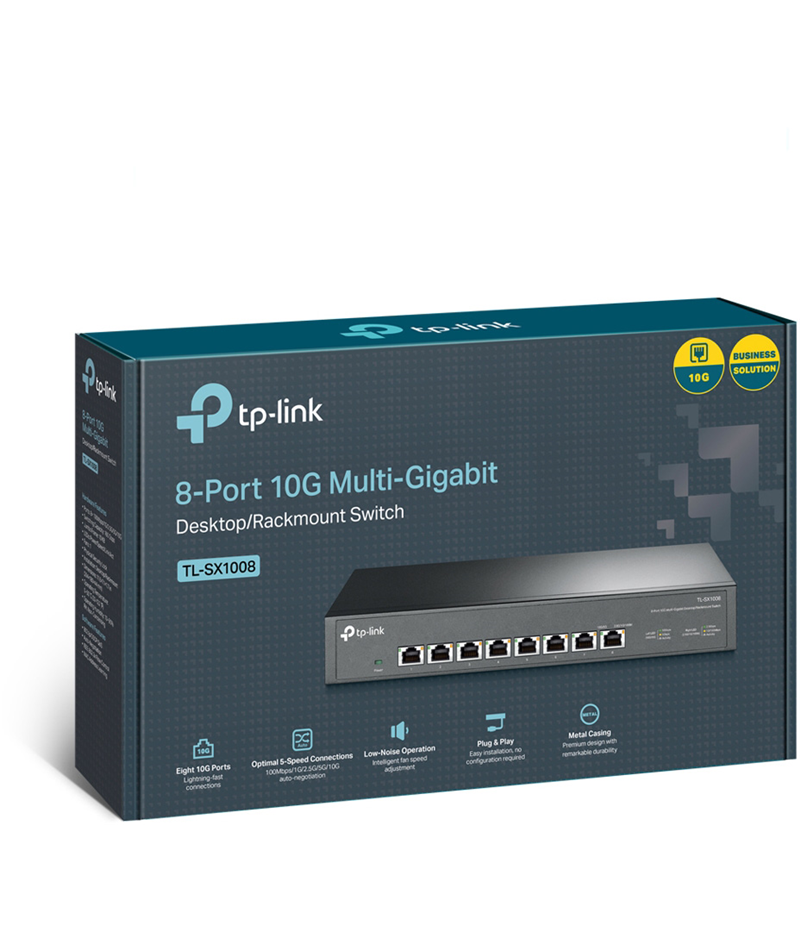 8-портовый настольный/монтируемый в стойку коммутатор 10 Гбит/с TL‑SX1008 — это флагманский продукт, обеспечивающий надёжные сверхскоростные подключения с минимальной задержкой и коммутационную ёмкость 160 Гбит/с с автосогласованием скорости (100 Мбит/с / 1 Гбит/с / 2,5 Гбит/с / 5 Гбит/с / 10 Гбит/с).