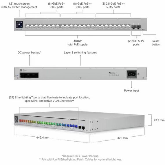 | Особенности | 1.3" Touchscreen дисплей. 24 порта RJ45 - 8x GbE PoE+, 8x GbE PoE++ и 8x 2.5 GbE PoE++. |