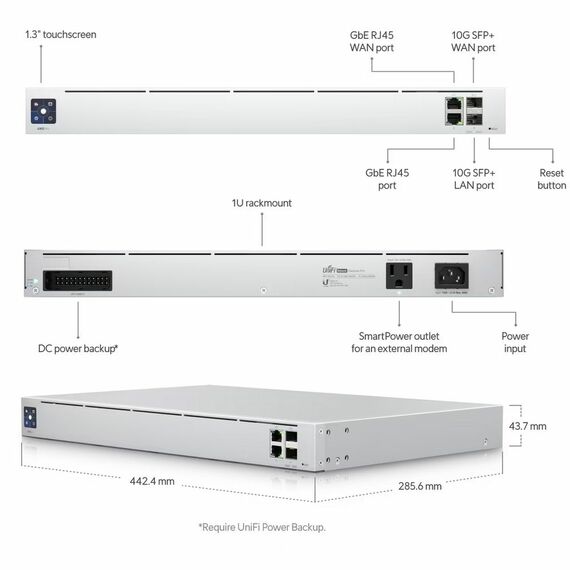 | Особенности | LAN - 1xRJ45+1xSFP+, WAN - 1xRJ45+1xSFP+. 1.3" Touchscreen LCD. Вход DC Power Backup для резервирования питания (реком-ся UniFi Power Backup), разъем SmartPower (для внешн.модема). Кнопка Reset |