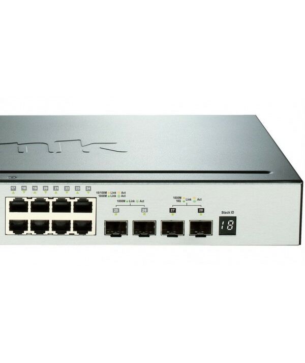 - Stackable: поддерживается, D-Link Single IP Management (SIM), до 32 устройств в виртуальном стеке, полоса пропускания 20 Гб; до 6 устройств в физическом стеке, полоса пропускания до 40 Гб
