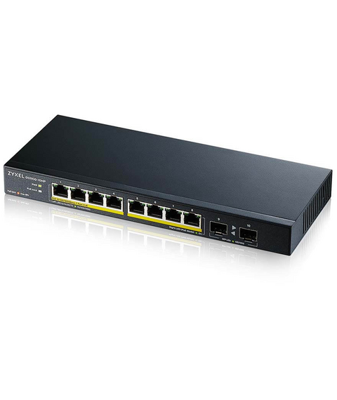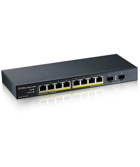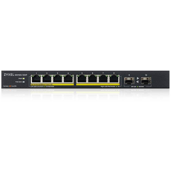 Коммутатор ZyXEL GS1100-10HP-EU0102F 8xGE PoE+, 2xSFP PoE+, Desktop, Silen,t 130W PoE Budget, Kensigton lock