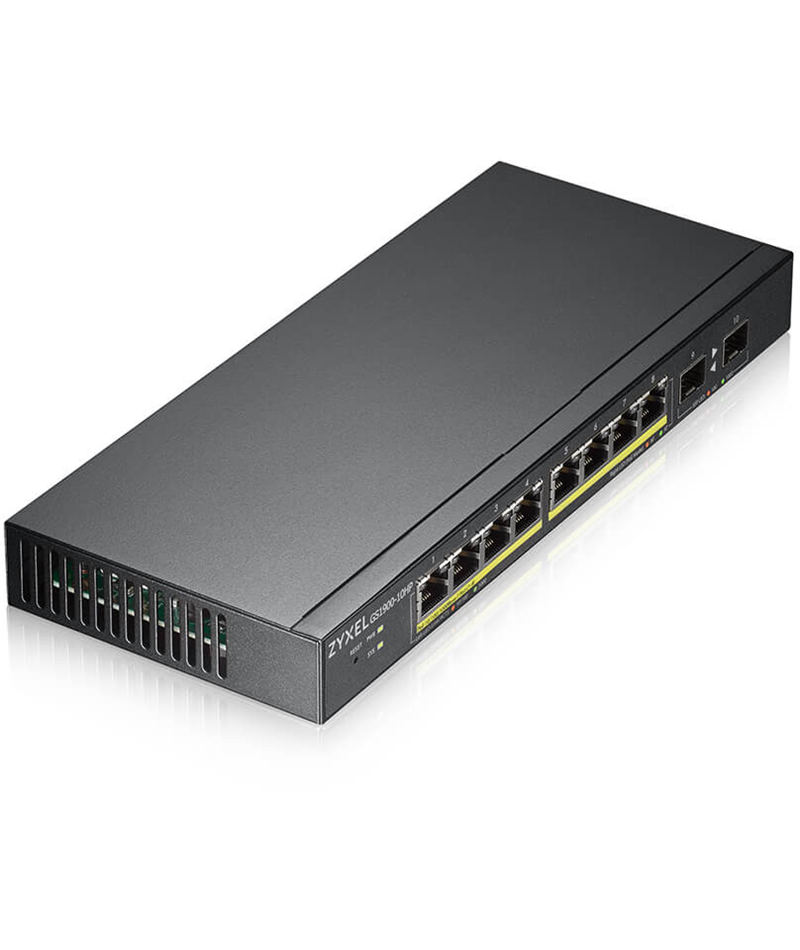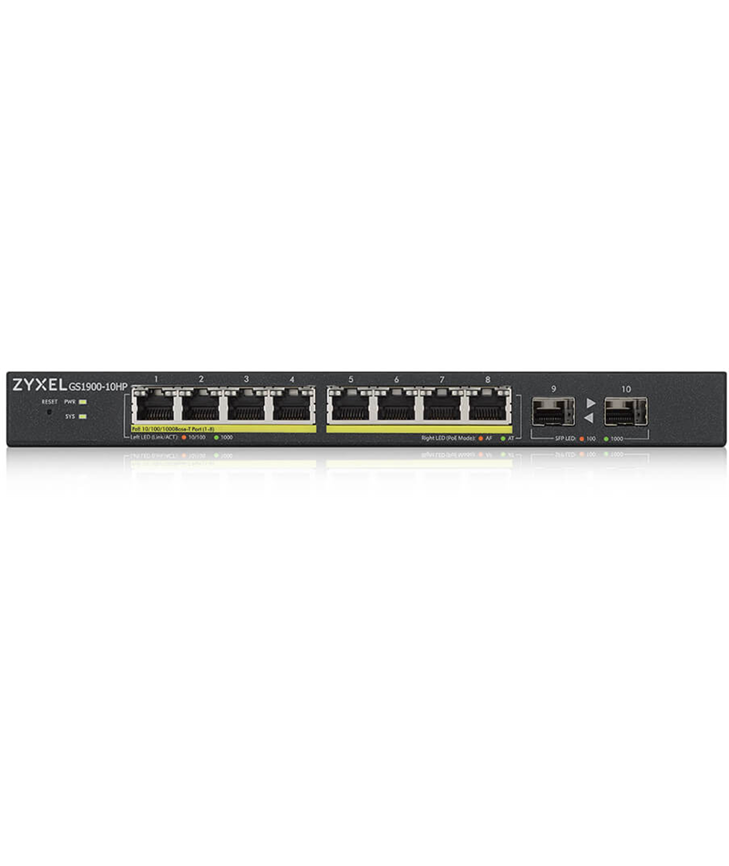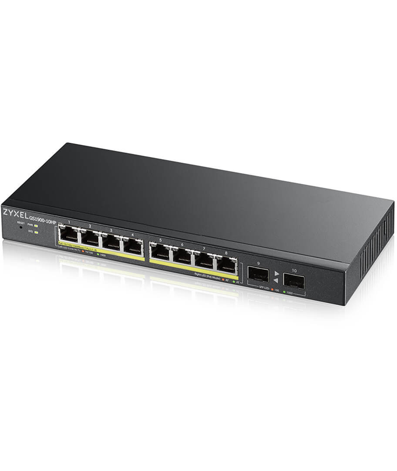 Коммутатор ZyXEL GS1900-10HP-EU0102F Smart L2 PoE+, 8xGE PoE+, 2xSFP, Desktop, Silent, Budget PoE 77W