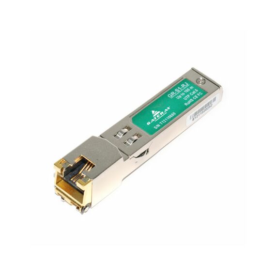 GR-S1-RJ - модуль с форм-фактором SFP (Small Form-factor Pluggable), скорость передачи данных до 1,25 Гбит/с на расстояние до 100 метров по витой паре (UTP) категории 5, разъем RJ-45.