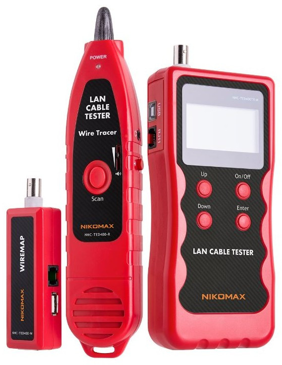 - Кабельный тестер NIKOMAX NMC-TED400TR с LCD дисплеем предназначен для работы с широким спектром кабелей. Это UTP/STP кабели витая пара, оконцованные разъемами RJ45, коаксиальные кабели с BNC разъёмами, телефонные кабели RJ11/RJ12, USB кабели (type A - type B)