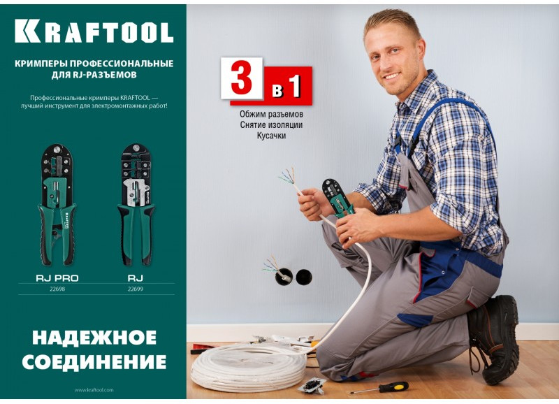 - обжим разъёмов на 6 контактов (RJ11/ RJ12 )