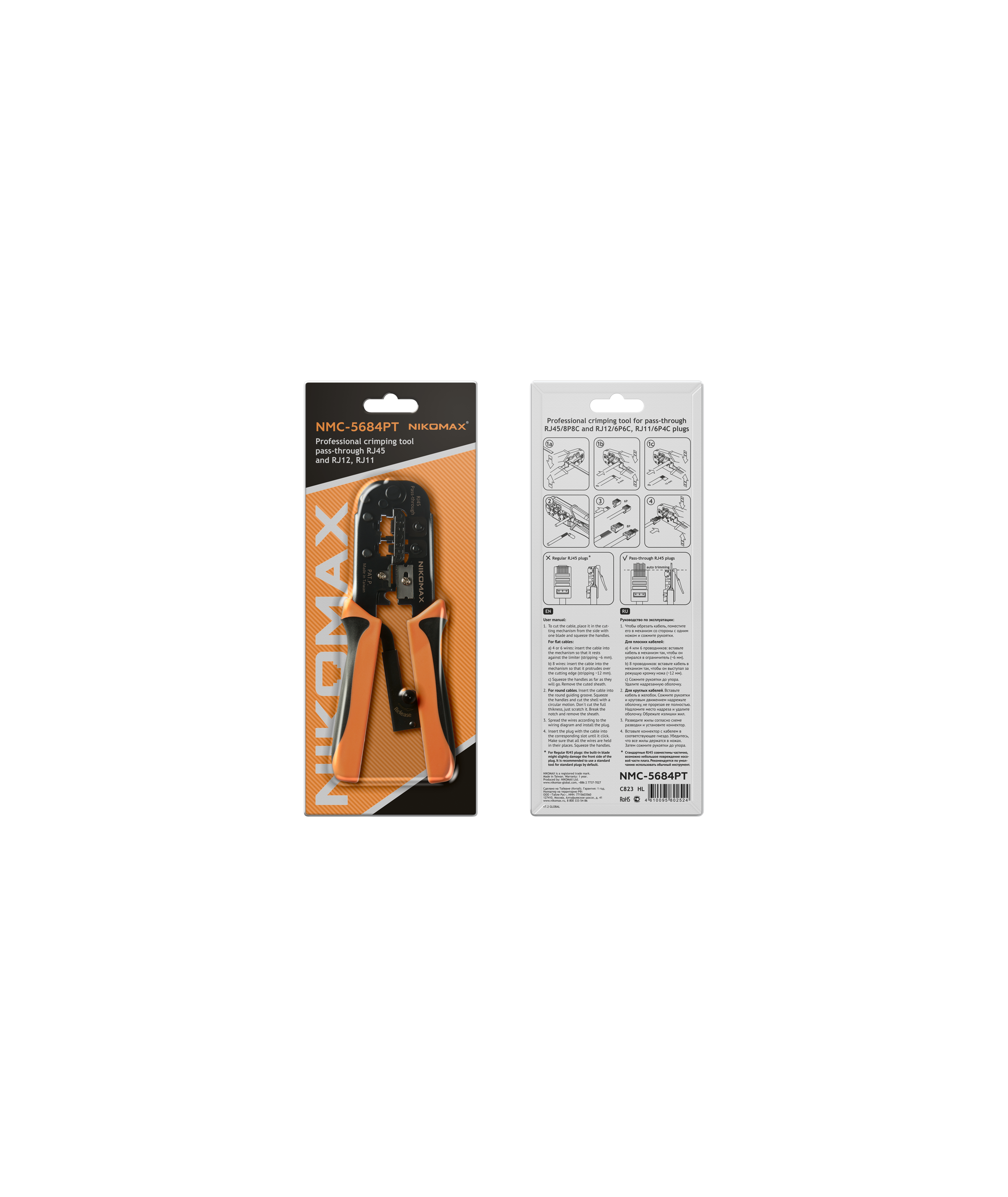 Обжимные инструменты (кримперы) предназначены для обжима коннекторов типа Registered Jack (RJ) на телефонных кабелях и кабелях передачи данных. Кримпер NMC-5684PT предназначен для обжима разъёмов типа RJ45/8P8C, RJ12/6P6C, RJ11/6P4C, 4P4C и 4P2C. Данный инструмент оборудован устройством для зачистки и обрезки кабеля, а также разработан специально для обжима проходных коннекторов серии PT (Pass-through plugs).