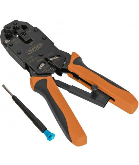 Обжимные инструменты (кримперы) предназначены для обжима коннекторов типа Registered Jack (RJ) на телефонных кабелях и кабелях передачи данных. Кримпер NMC-2008AR предназначен для обжима разъемов типа RJ45/8P8C, RJ12/6P6C, RJ11/6P4C, 4P4C и 4P2C. Инструмент оборудован устройством для зачистки и обрезки кабеля. Данный инструмент является профессиональным, благодаря “торцевому” обжиму и многофункциональности.