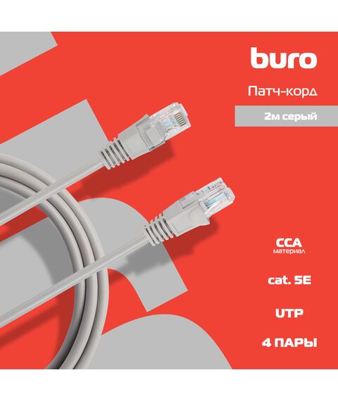 Патч-корд BURO UTP 4 пары cat.5E CCA molded 2м серый RJ-45 (m)-RJ-45 (m) [UTP-5E-2M-G]
