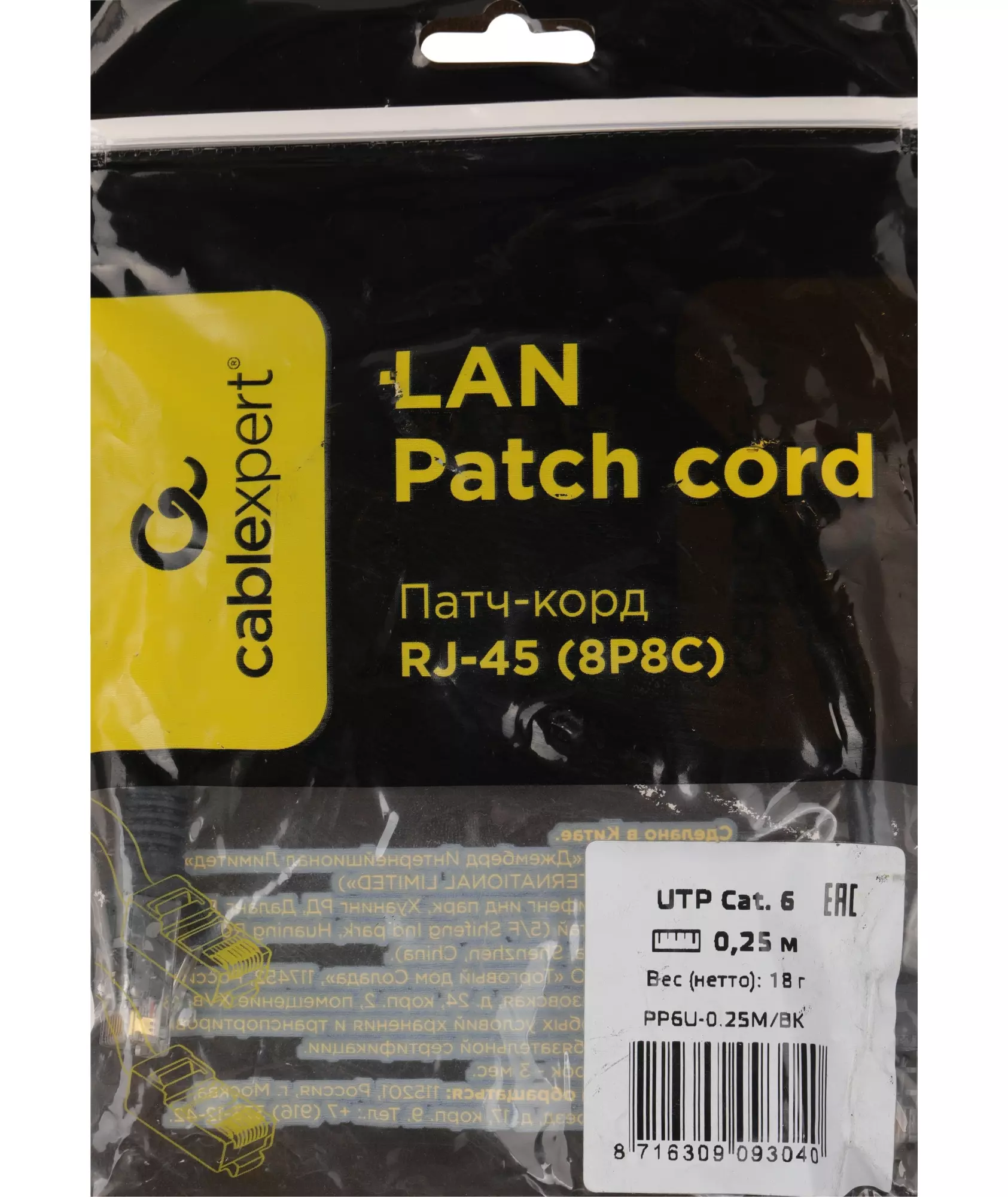 Патч-корд Premier 10000Гбит/с UTP 4 пары cat.6 CCA molded 0.25м черный RJ-45 (m)-RJ-45 (m) [PP6U-0.25M/BK]
