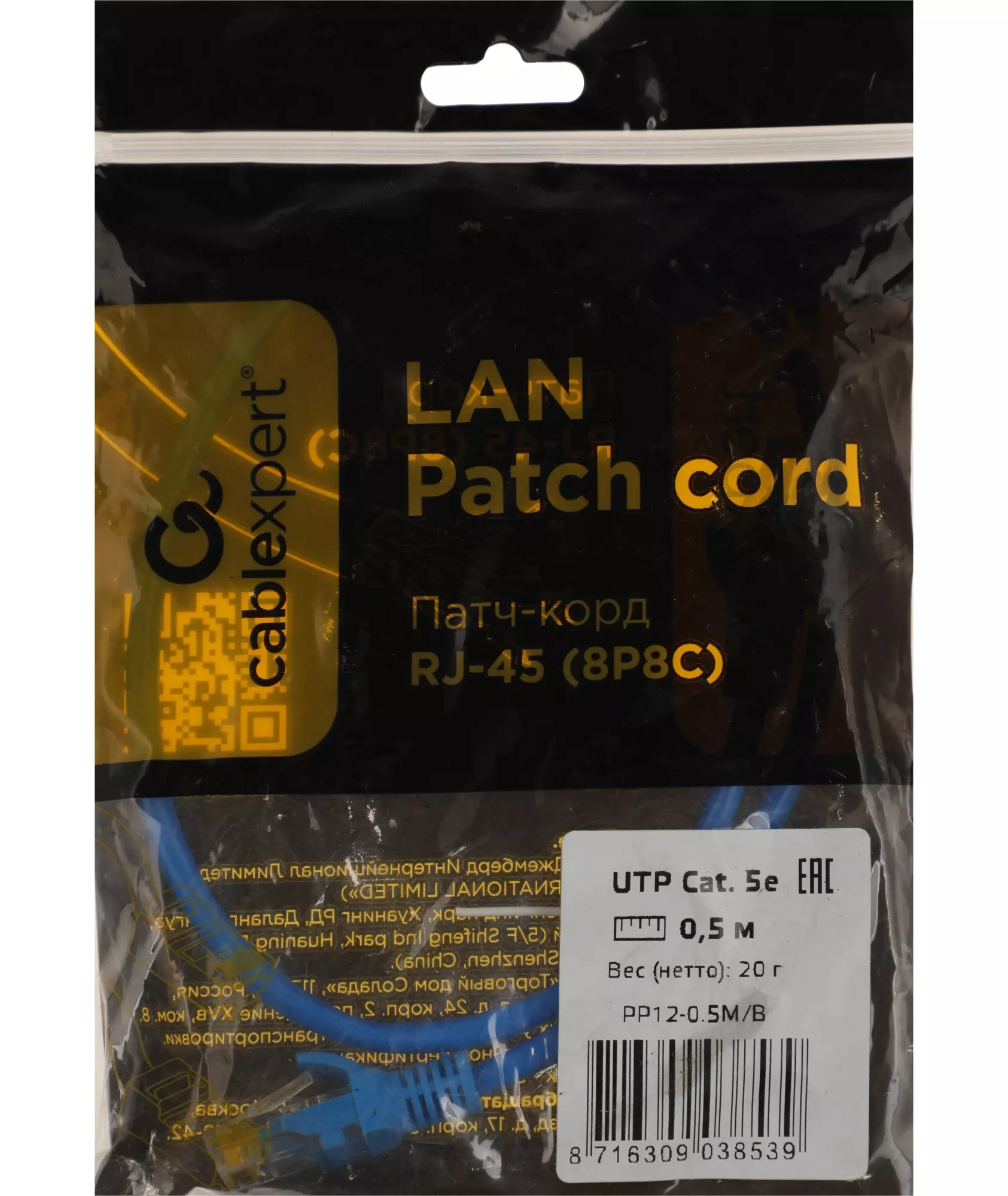 Патч-корд Premier 1000Гбит/с UTP 4 пары cat.5E CCA molded 0.5м синий RJ-45 (m)-RJ-45 (m) [PP12-0.5M/B]