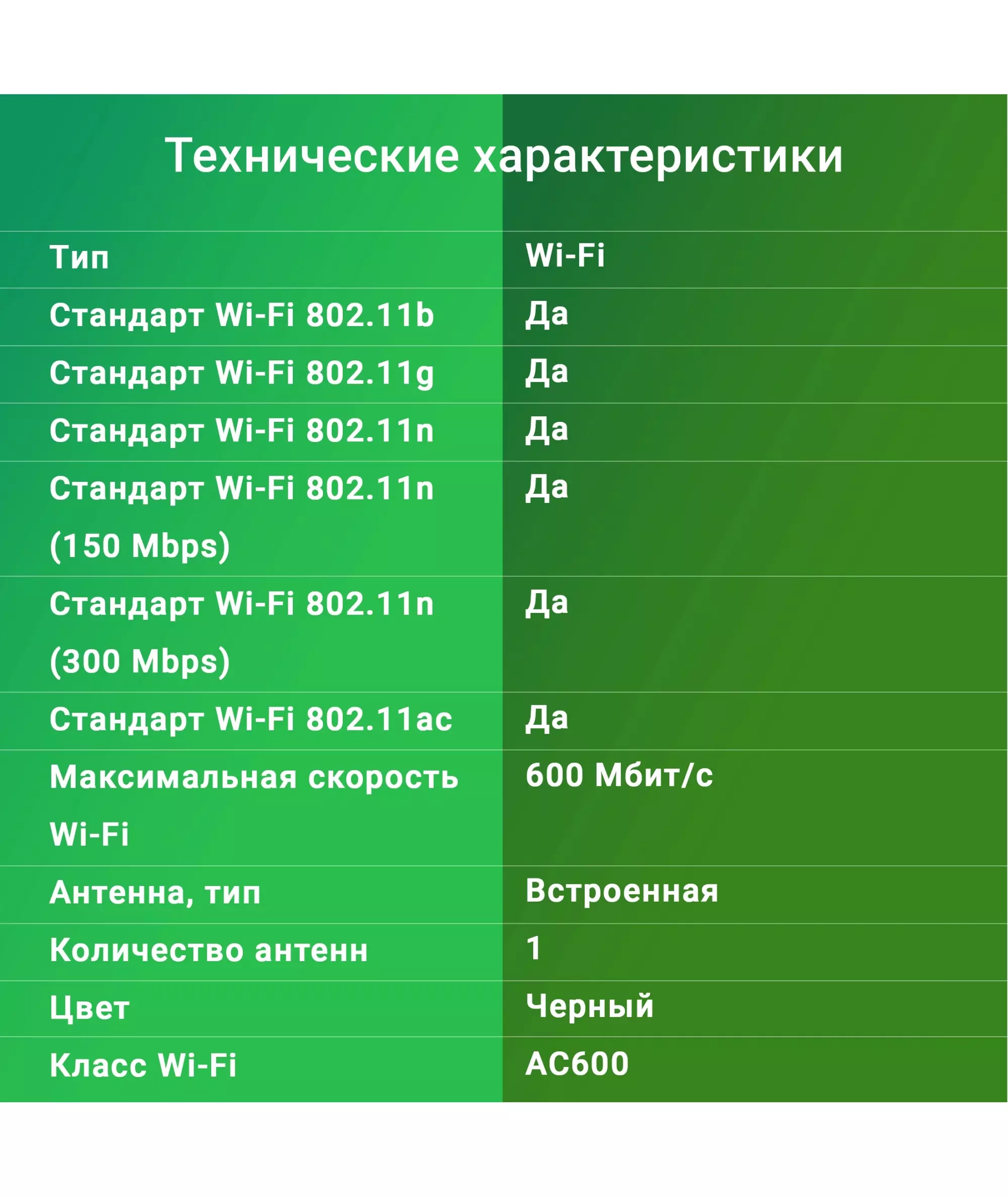 | Особенности | чип RTL8811CU, 2 диапазона 2.4ГГц и 5.8ГГц |