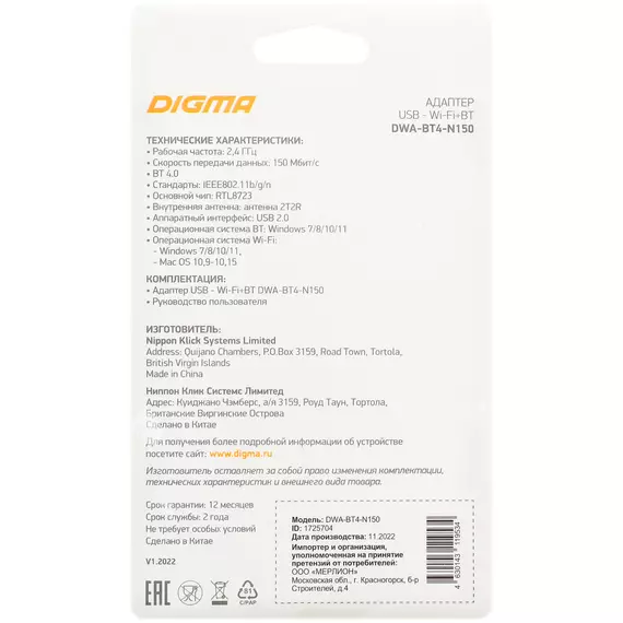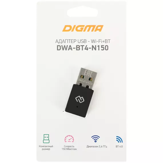 Сетевой адаптер Digma DWA-BT4-N150 Wi-Fi + Bluetooth N150 USB 2.0 (ант.внут.) 1ант.