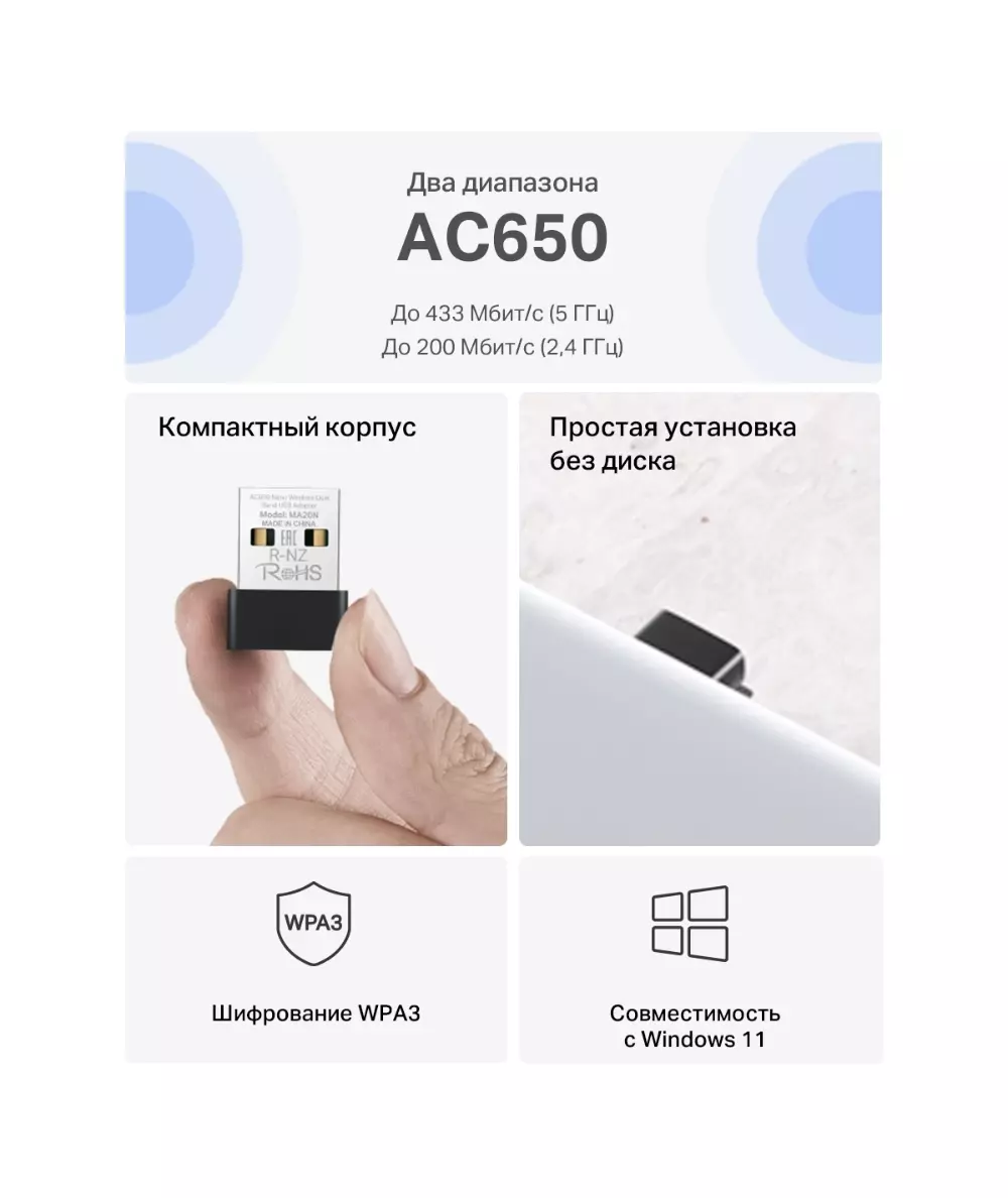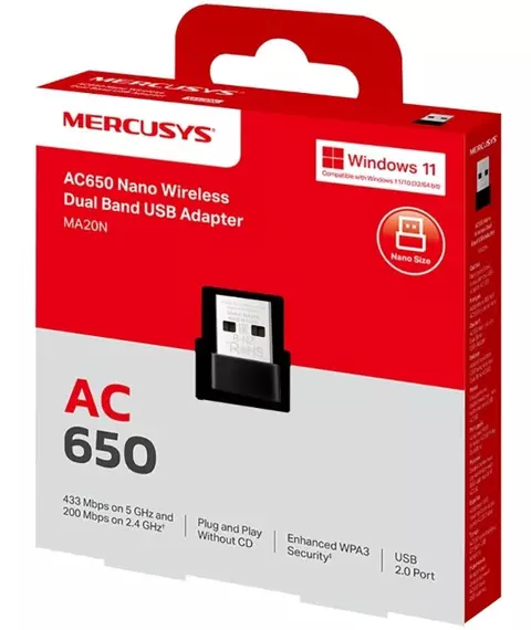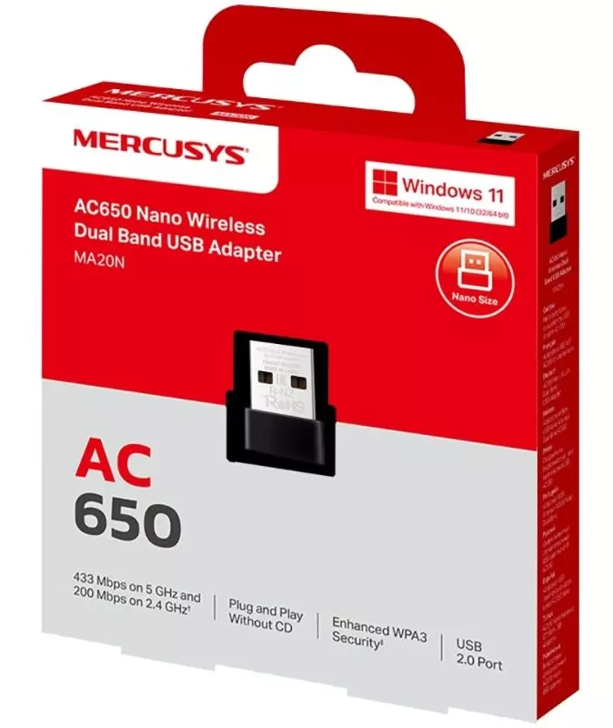 Сетевой адаптер Wi-Fi Mercusys MA20N AC650 USB 2.0 (ант.внутр.) 1ант.