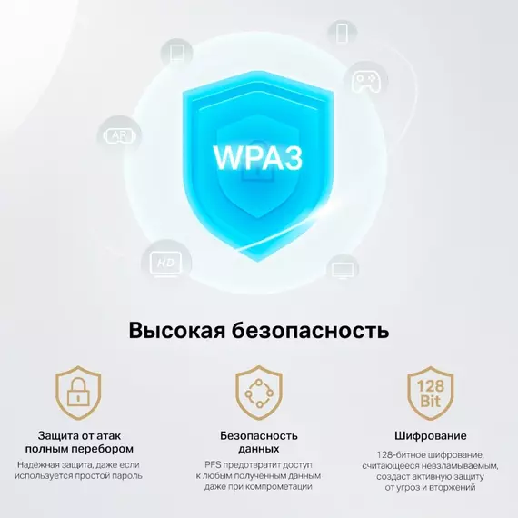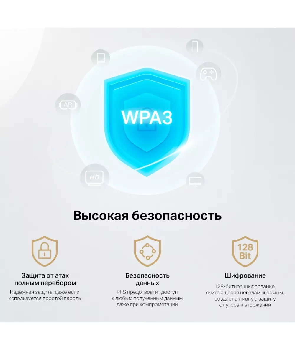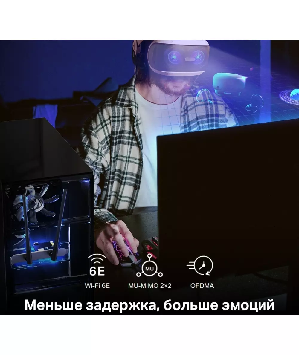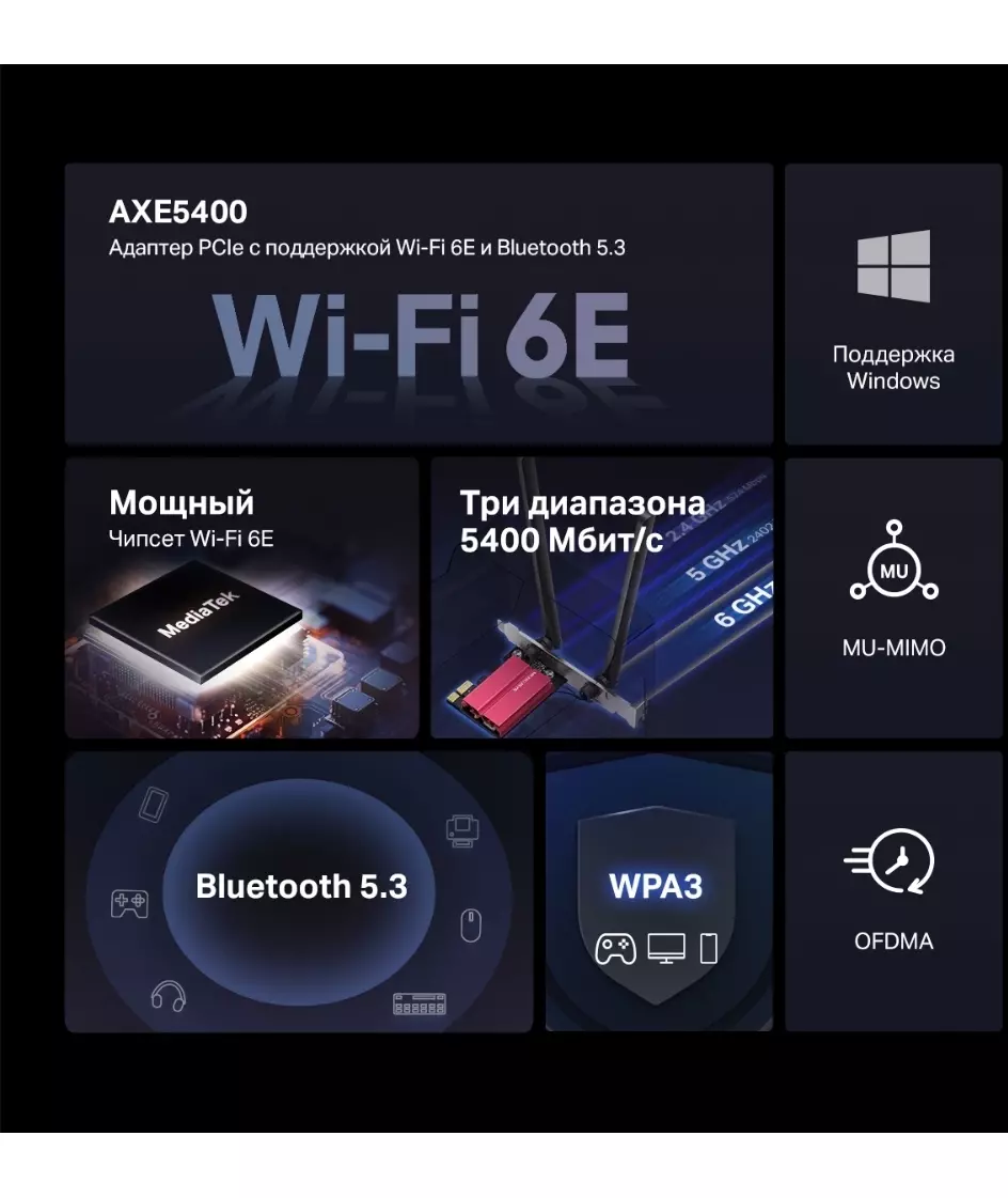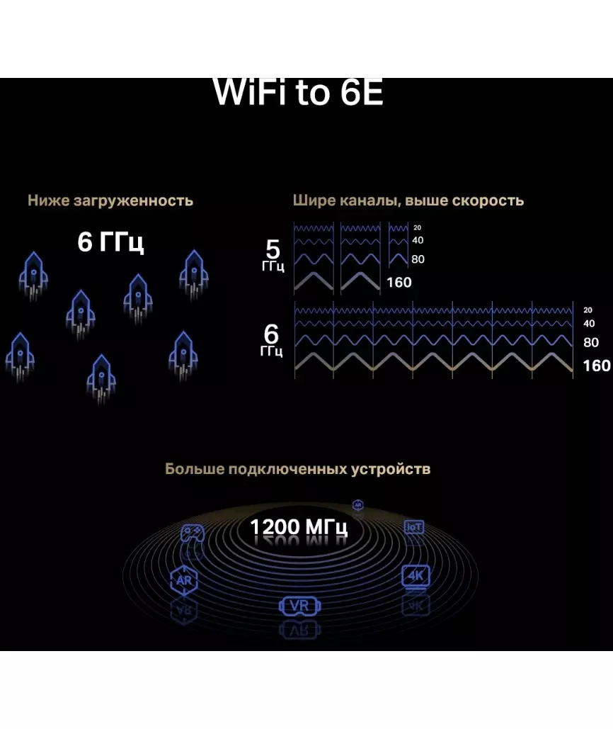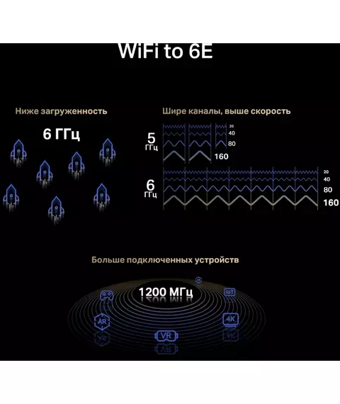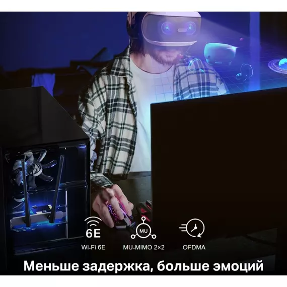 | Особенности | Три диапазона Wi-Fi — до 574 Мбит/с (2,4 ГГц) + до 2402 Мбит/с (5 ГГц) + до 2402 Мбит/с (6 ГГц).Wi-Fi 6E — позволит получить доступ к менее загруженному диапазону 6 ГГц.Большая площадь покрытия — за счёт двух высокопроизводительных антенн. |