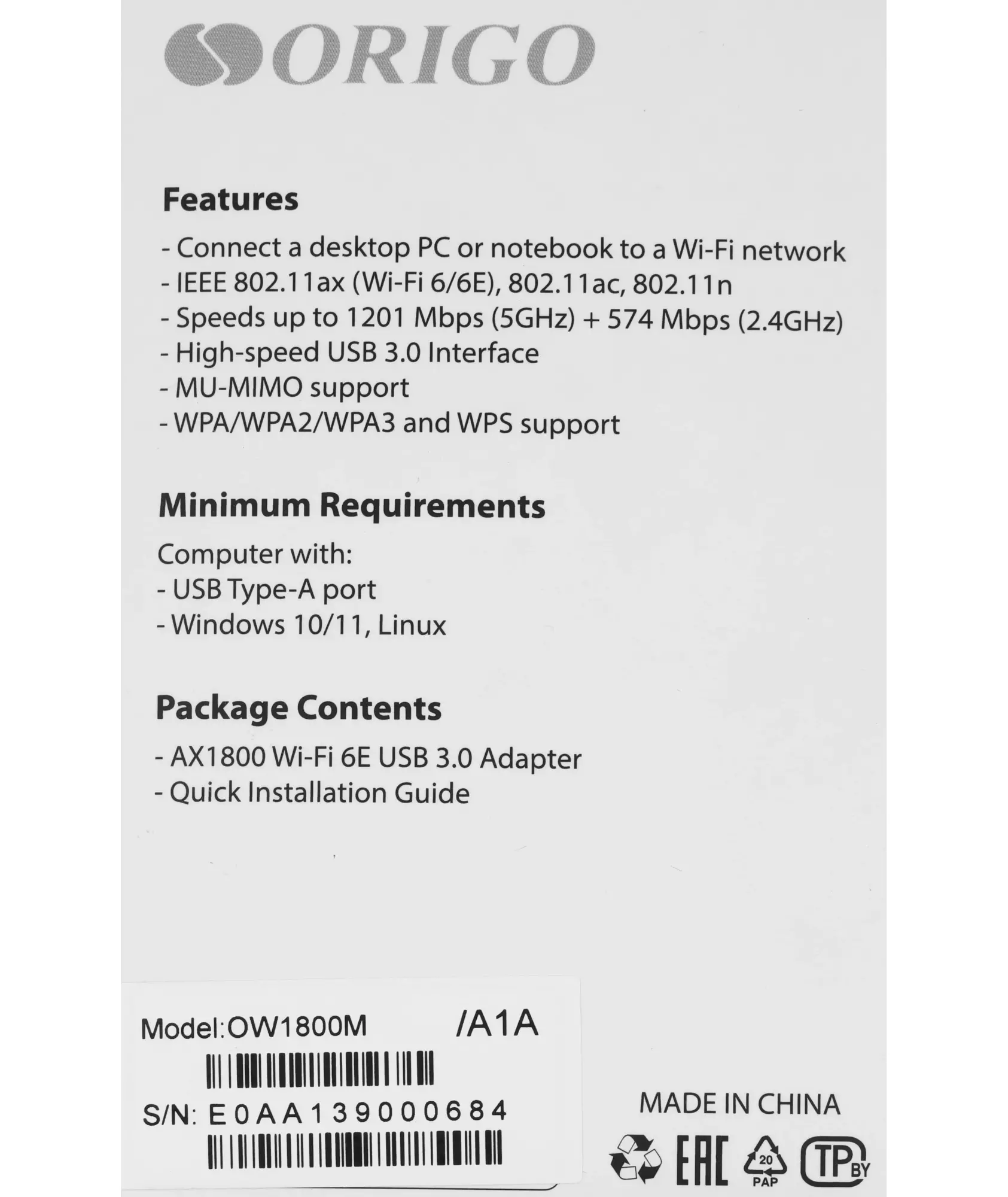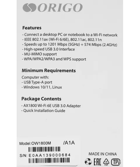 Сетевой адаптер Wi-Fi ORIGO OW1800M/A1A AX1800 USB 3.0 (ант.внеш.несъем.) 2ант.