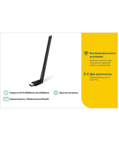 | Особенности | Высокая скорость Wi-Fi: поддержка 256QAM обеспечивает скорость до 200 Мбит/с на 2,4 ГГц или до 433 Мбит/с на 5 ГГц. Wi-Fi на двух диапазонах: 2,4 ГГц и 5 ГГц. 5 дБи антенна высокого усиления обеспечивает широкое и стабильное покрытие сети. Полная совместимость с ОС Windows 10/8.1/8/7/XP и Mac OS X. |