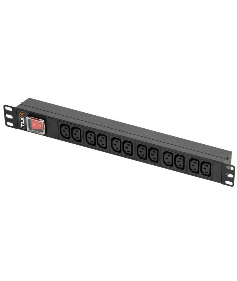 Блок электрических розеток TLK TLK-RSA12-MTF-01-BK 19", 12 гнезд C13, макс. нагрузка 10 А, без шнура питания, вход С14 + предохранитель 10 А, металлический корпус, макс. мощность 2500 Вт, 483*44.4*44.4 мм