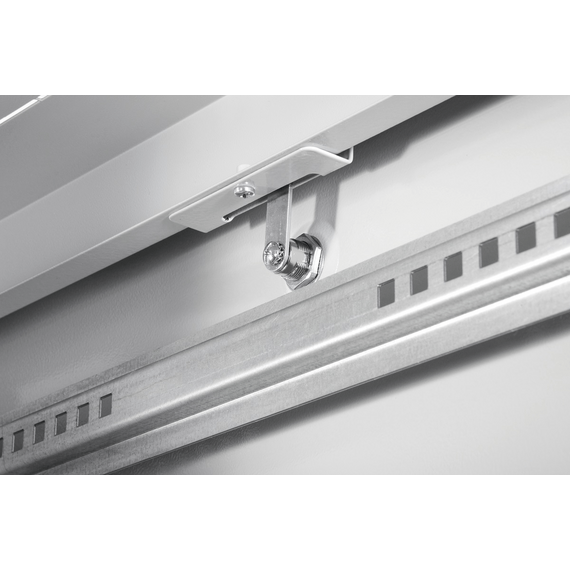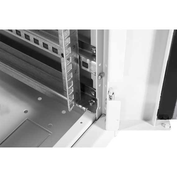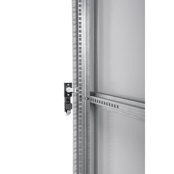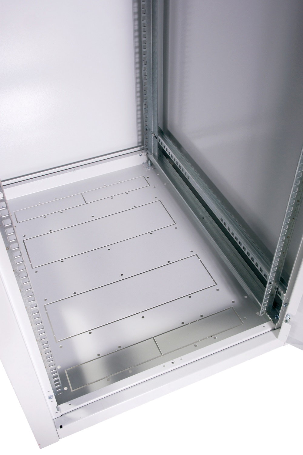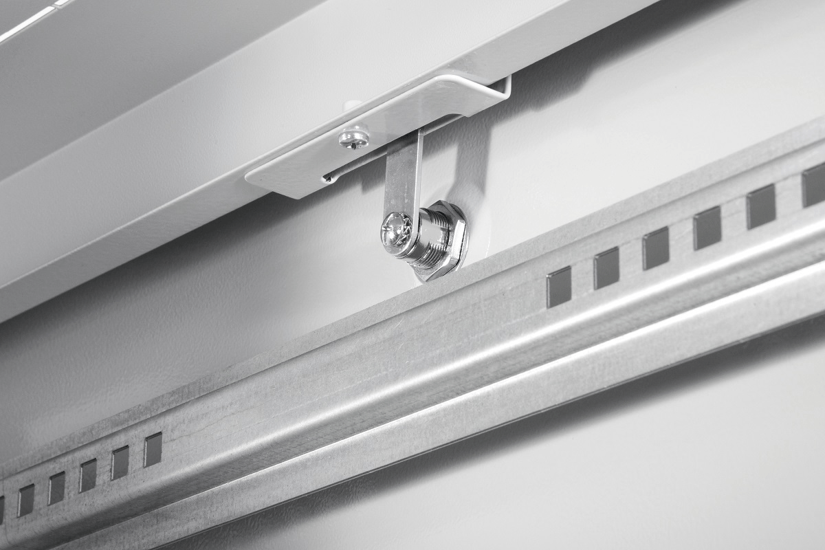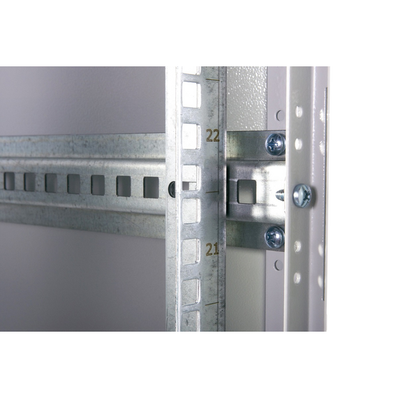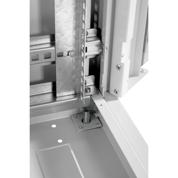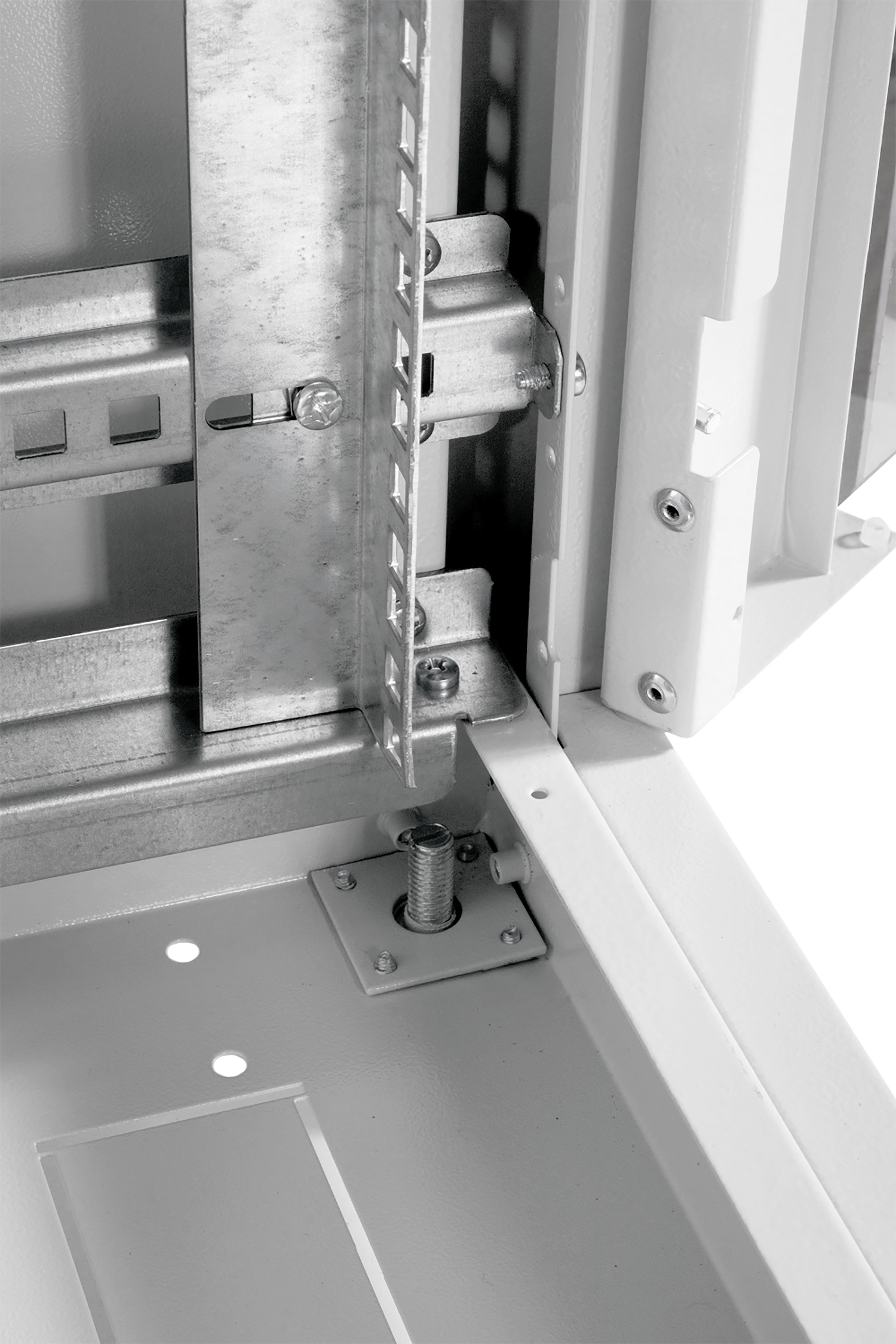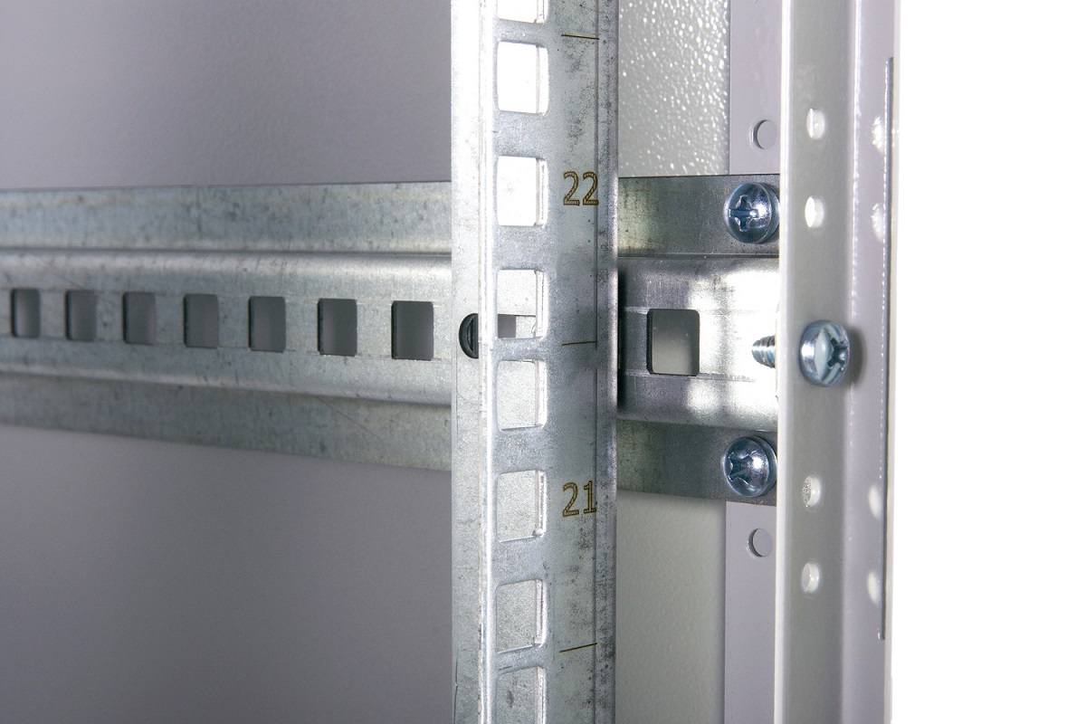 Шкаф имеет 4 оцинкованные вертикальные направляющие, регулируемые по глубине. Система заземления входит в стандартную комплектацию.