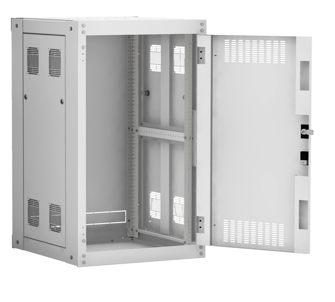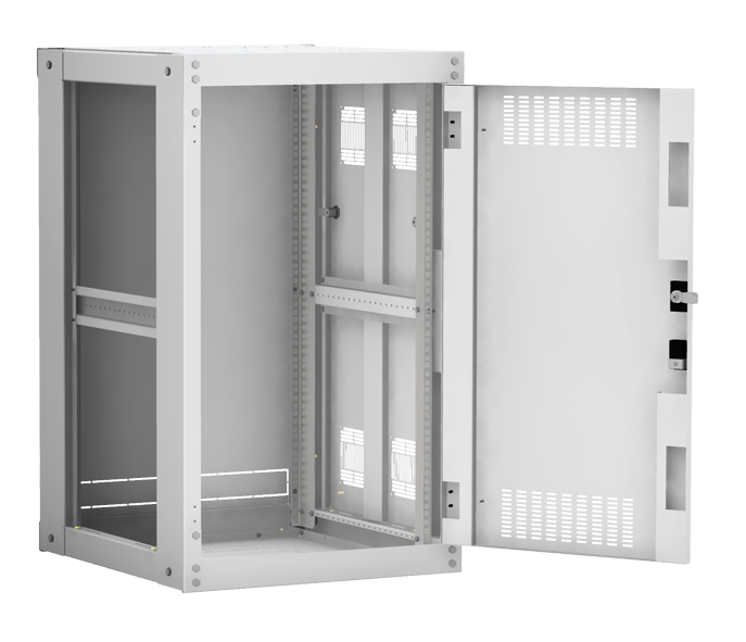 Наличие у шкафа двери с углом открытия 180 градусов и съемных боковых панелей и задней панели, предоставляет доступ для установки и обслуживания оборудования с четырех сторон.