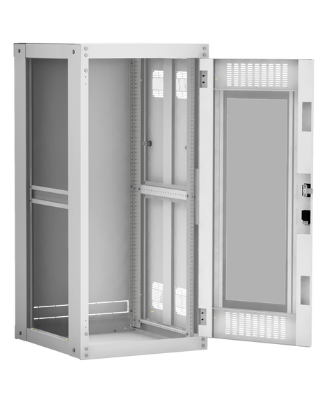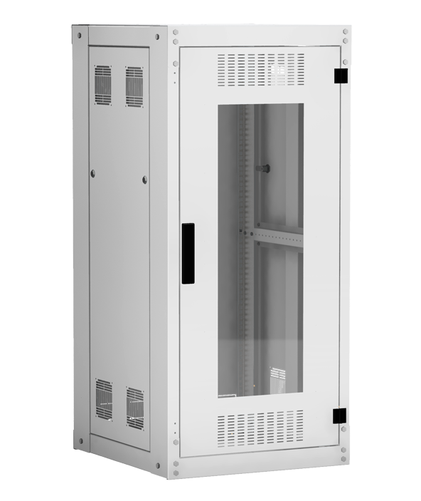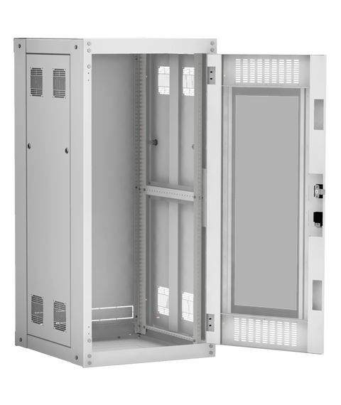 Наличие у шкафа двери с углом открытия 180 градусов и съемных боковых панелей и задней панели, предоставляет доступ для установки и обслуживания оборудования с четырех сторон.