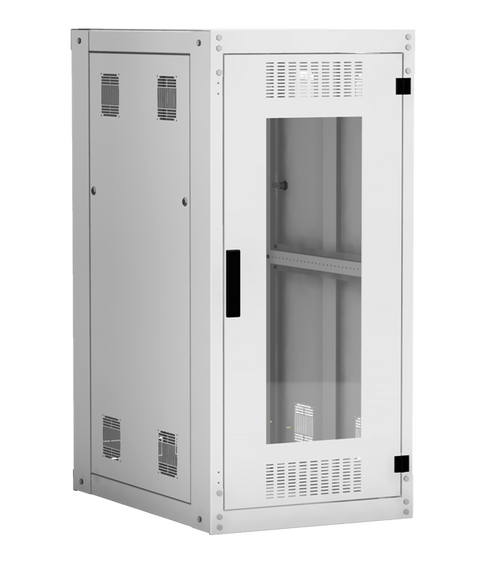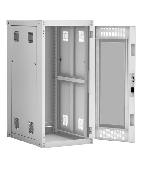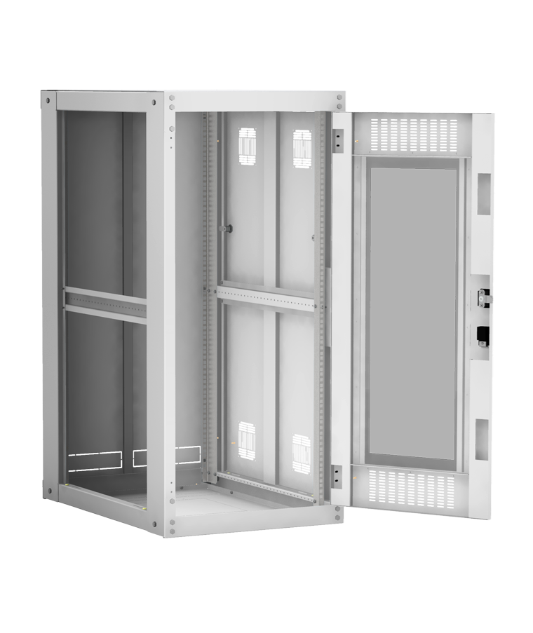 Наличие у шкафа двери с углом открытия 180 градусов и съемных боковых панелей и задней панели, предоставляет доступ для установки и обслуживания оборудования с четырех сторон.