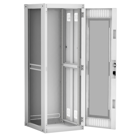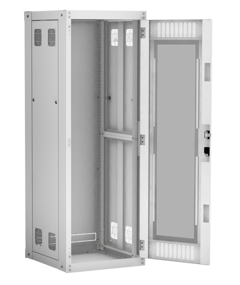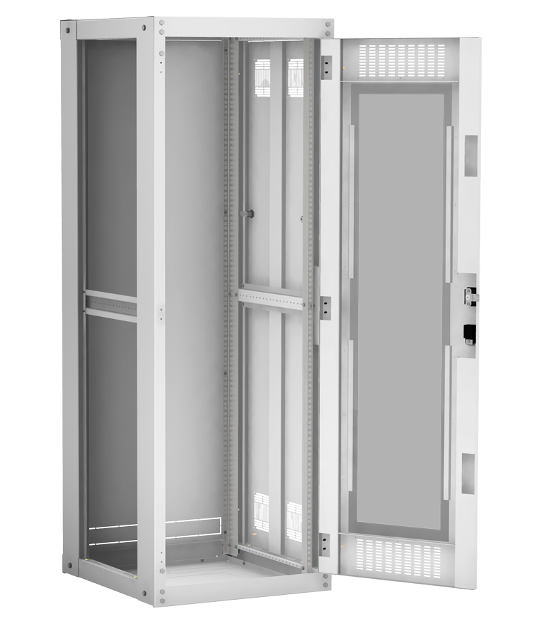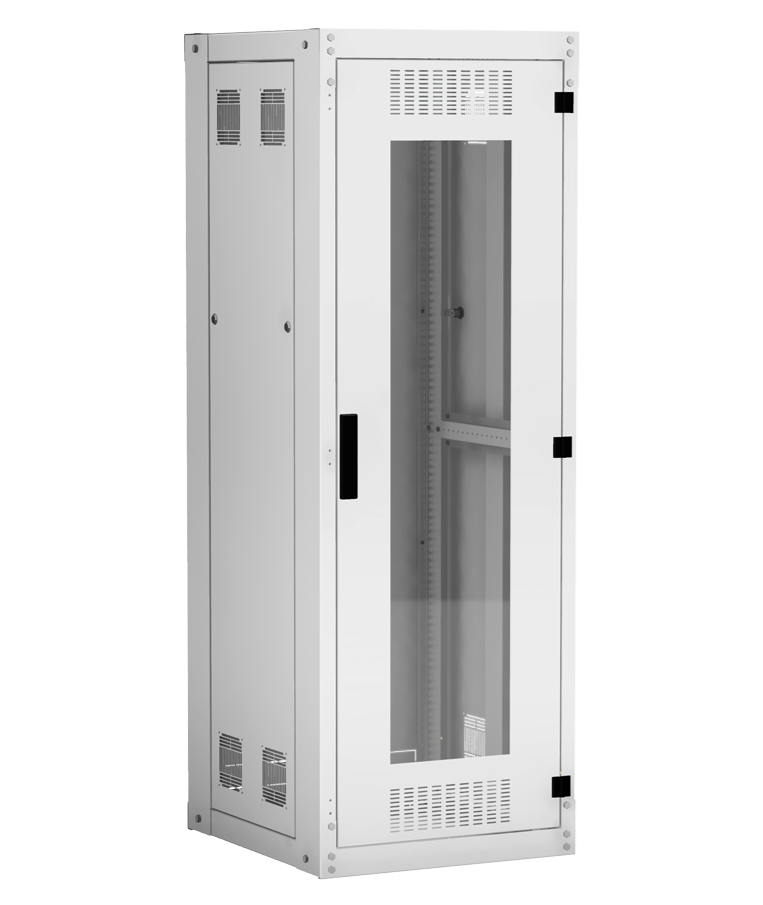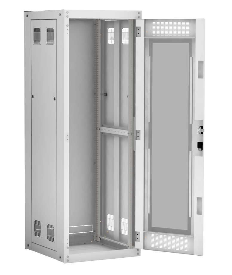 Наличие у шкафа двери с углом открытия 180 градусов и съемных боковых панелей и задней панели, предоставляет доступ для установки и обслуживания оборудования с четырех сторон.