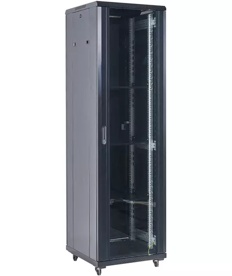 Шкаф коммутационный напольный Rexant 04-3266-212 32U 600x600мм пер.дв.стекл металл 2 бок.пан. направл.под винты 800кг черный 67кг 230град. 1609мм IP20 сталь