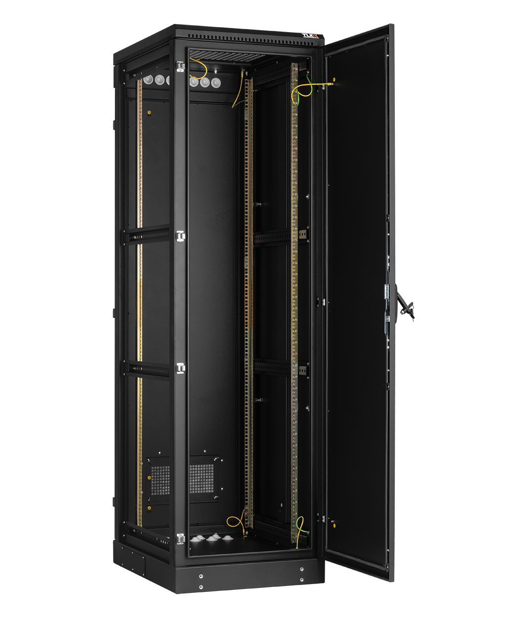 Наличие в дверях и боковых панелях замков с поджимом, обеспечивают надежную фиксацию в закрытом положении, а уплотнительный контур дверей и боковых проемов шкафа герметичность в условиях незначительной вибрации или ударных воздействий в месте установки шкафа. Для установки телекоммуникационного оборудования, внутри шкафа располагаются две пары монтажных направляющих 19" регулируемые по глубине. Цифровая маркировка юнитов (U) монтажных направляющих 19", создает дополнительное удобство при размещении оборудования.