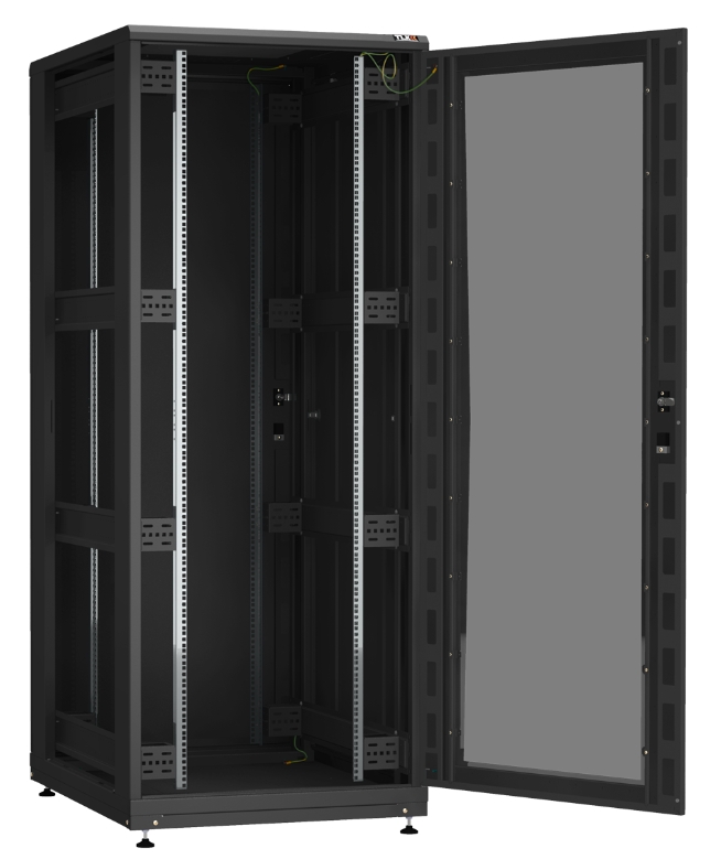 Шкаф TFR-R представляет собой металлическую, сборно-разборную конструкцию, в основе которой несущий каркас, состоящий из: двух вертикальных рам, дверей, основания, потолочной панели, восьми соединительных перемычек (для высот от 33U и выше).