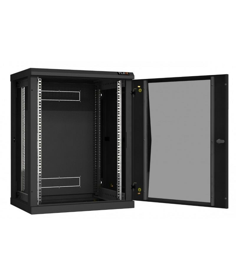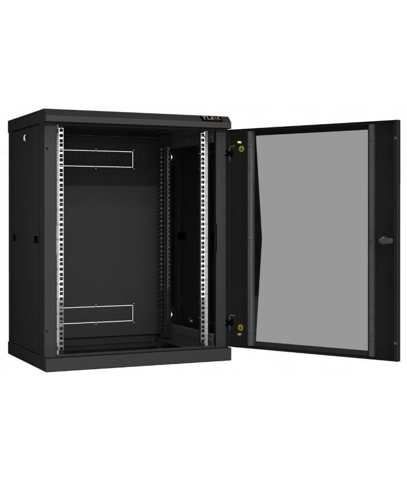 Настенный разборный шкаф TLK TWC-156045-R-G-BK 19", 15U, стеклянная дверь, Ш600хВ770хГ450мм, 2 пары монтажных направляющих, черный