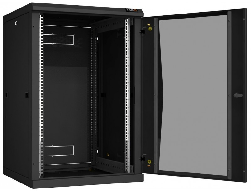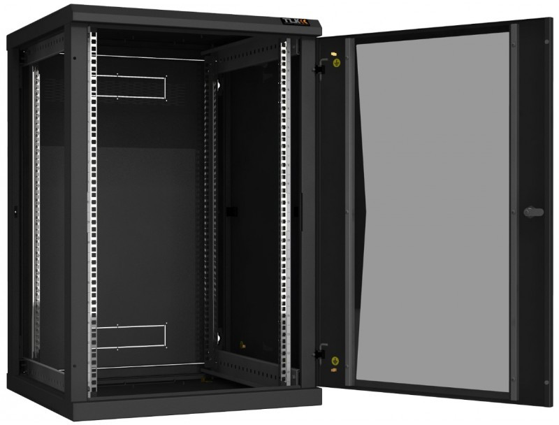 Настенный разборный шкаф TLK TWC-186060-R-G-BK 19", 18U, стеклянная дверь, Ш600хВ904хГ600мм, 2 пары монтажных направляющих, черный