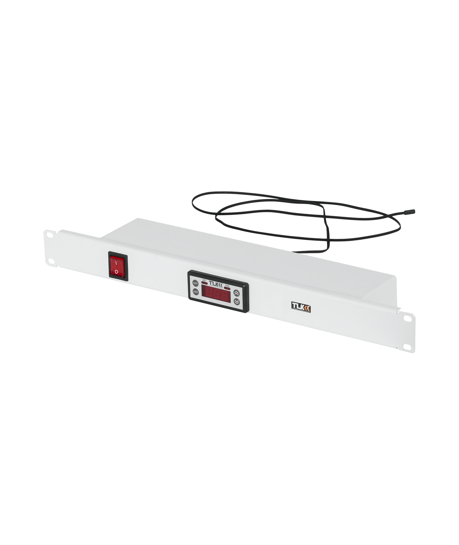 В зависимости от настроек терморегулятора, контроллер включает или выключает вентиляторные устройства. Контроллер оснащен информационным дисплеем и удобным интерфейсом для изменения настроек. Панель с терморегулятором выполнена в виде корпуса, предназначенного для установки на вертикальные 19’’ направляющие. Крепление производится с помощью винтов М6. Панель оснащена вводом питания с предохранителем и кнопкой для включения и выключения. Для подключения устройств используются розетки IEC 320 C14. Шнур датчика температуры имеет длину 1,5 метра.