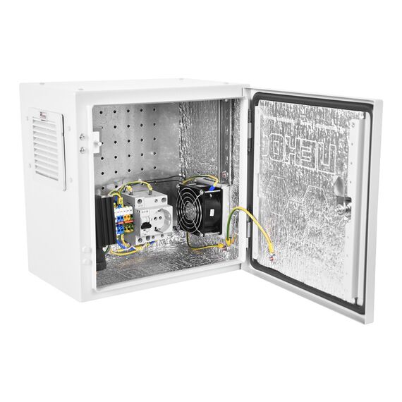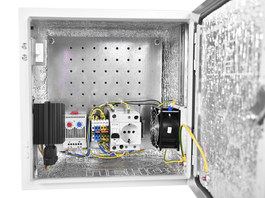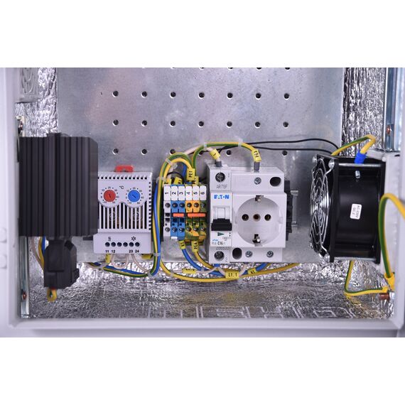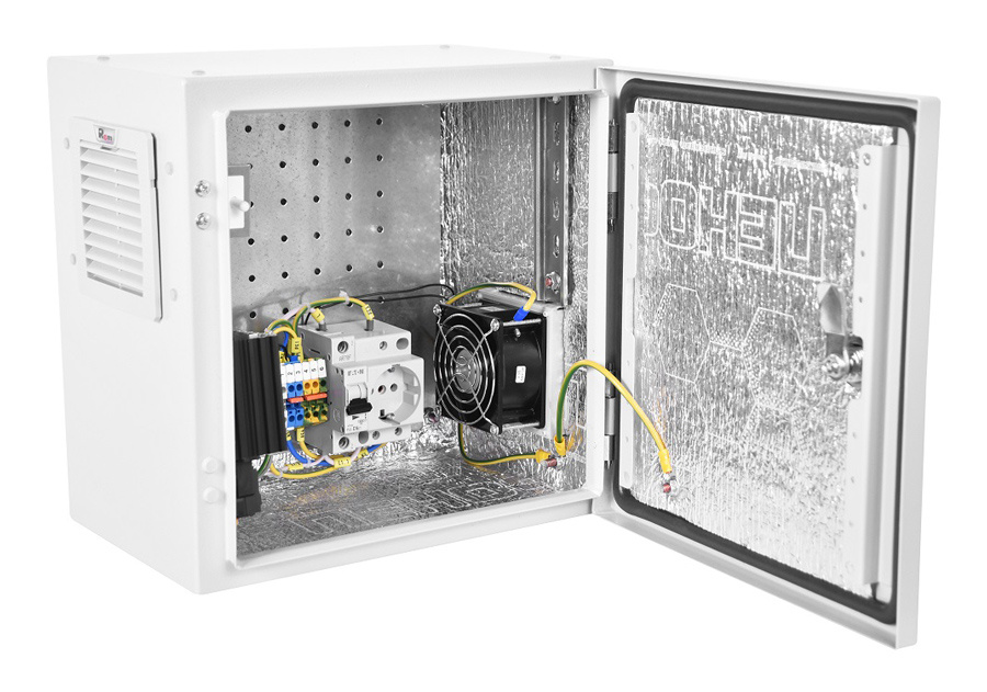 Шкаф монтажный ЦМО ШТВ-НЭ-4.4.21-3ВВА-Т1 Эконом настенный 400x210мм пер.дв.стал.лист задн.дв.спл.стал.лист несъемн.бок.пан. серый 180мм 400мм IP54 уличный всепогодный с вентилятором с нагревателем с силовыми розетками укомплектованный 60Вт