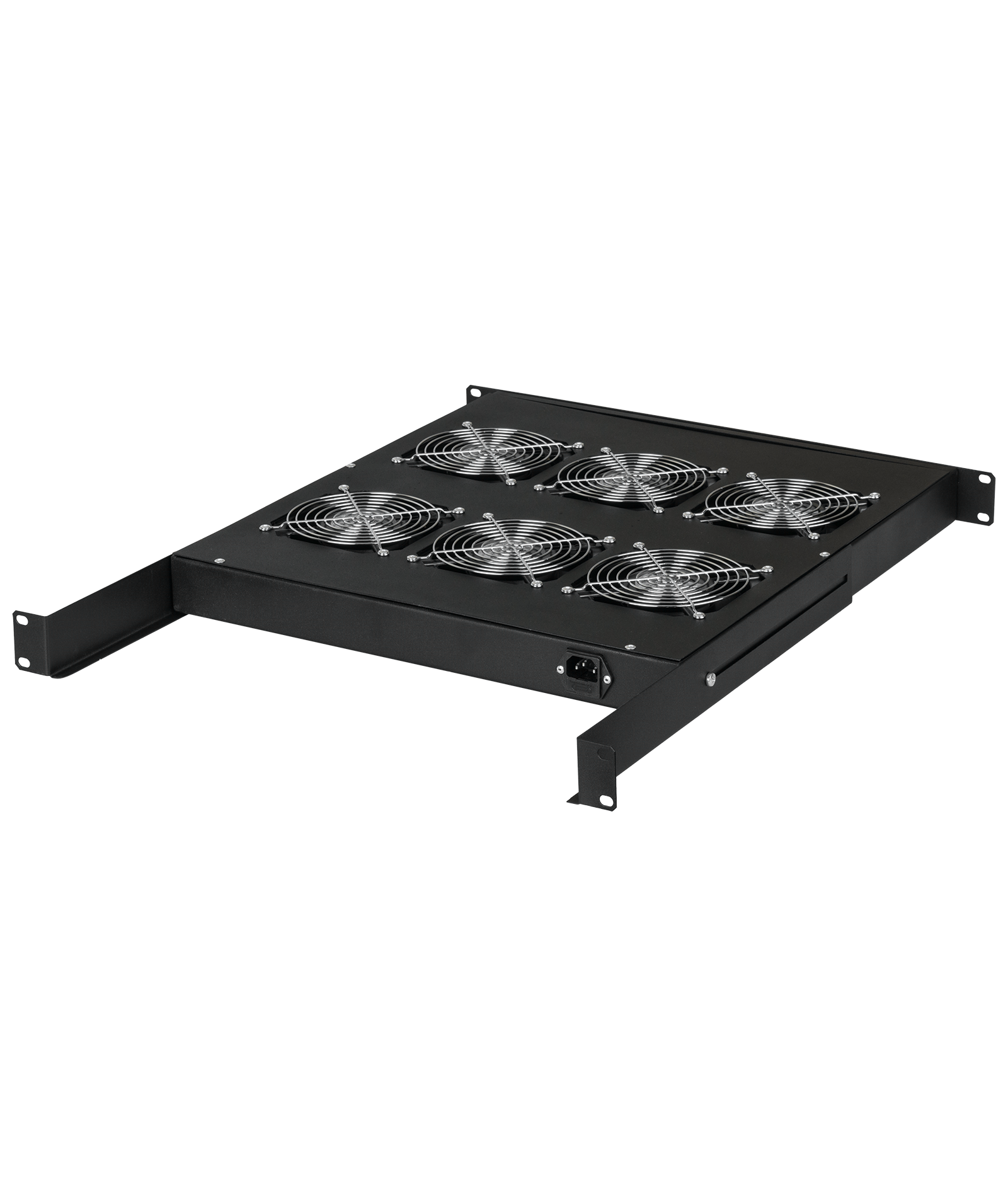 Вентиляторная полка предназначена для создания дополнительного потока воздуха в местах сосредоточения активного оборудования в телекоммуникационном шкафу. Вентиляторные полки можно устанавливать в напольные шкафы и стойки в соответствии с таблицей совместимости аксессуаров. Питание вентиляторной полки осуществляется с помощью подключения шнура питания к сети с напряжением 220 В, 50 Гц. Разъем питания на вентиляторном блоке типа IEC-60320 C14. Вентиляторная полка выполнена в 19” стандарте. Несущая конструкция вентиляторной полки выполнена из 2 мм стали. Вентиляторы закрыты решетками с обеих сторон. Включение/выключение полки осуществляются пользователем. Полка крепятся к направляющим с помощью комплекта крепежа. Крепеж не входит в комплект поставки. Антикоррозионное покрытие выполнено ударопрочной порошковой краской черного цвета. Вентиляторная полка на 6 вентиляторов, глубиной 520 мм, снабжена дополнительными кронштейнами для крепления за заднюю часть. Кронштейны можно регулировать по вылету для подстройки под глубину направляющих шкафа.