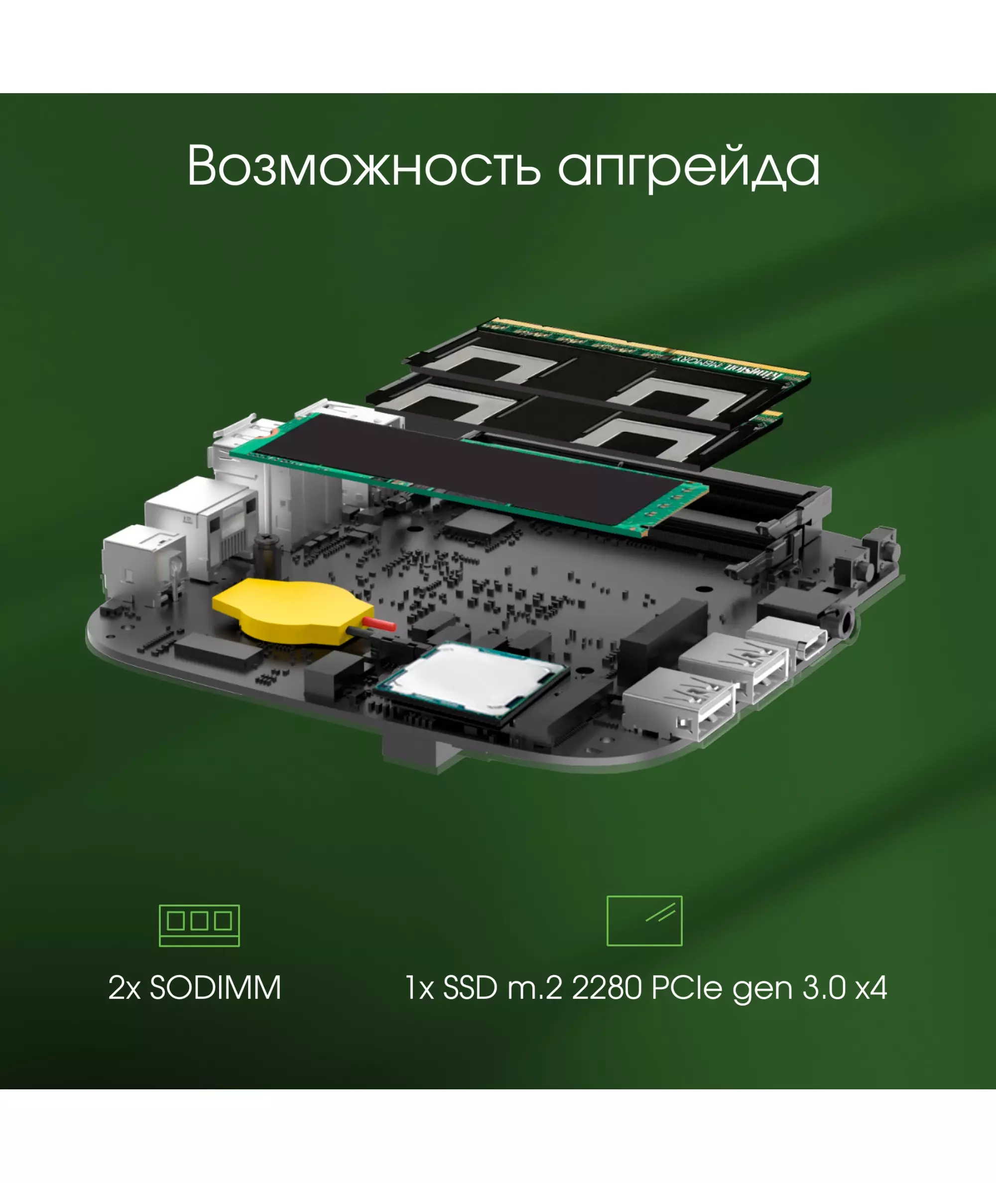 2xSO-DIMM DDR4; SSD M.2 2280 PCIe Gen3 x4